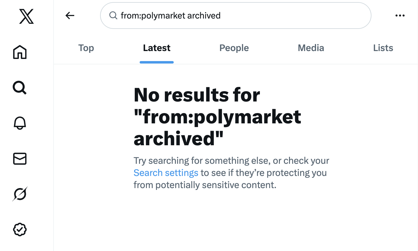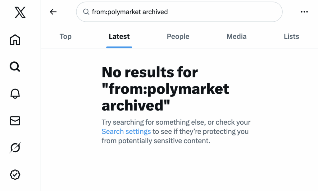 A search for “archived” in the Polymarket help center returns zero results, as does a search on X for any Polymarket posts that include the word “archived.”
