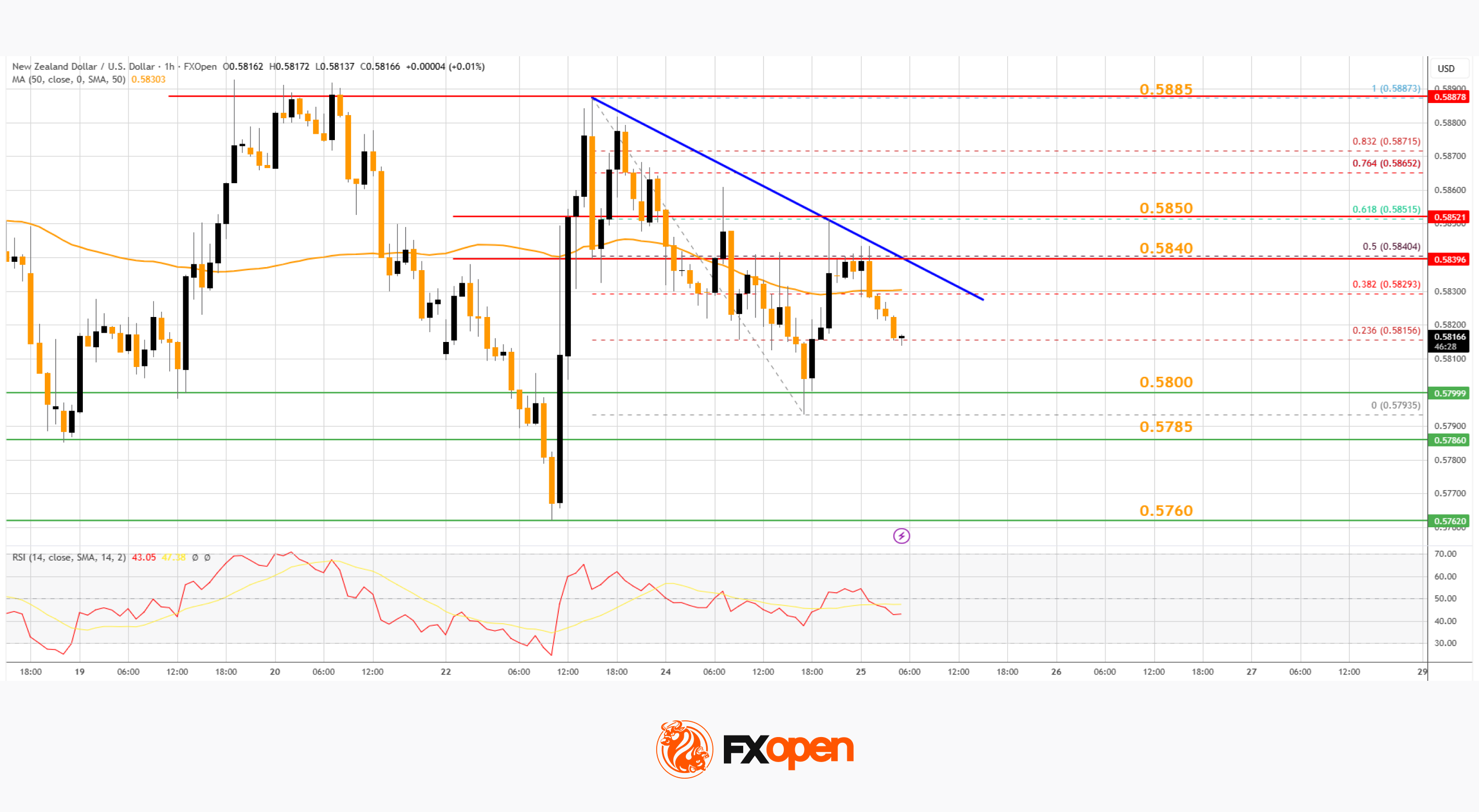 · There is a major bearish trend line forming with resistance near 0.5840 on the hourly chart of NZD/USD at FXOpen.