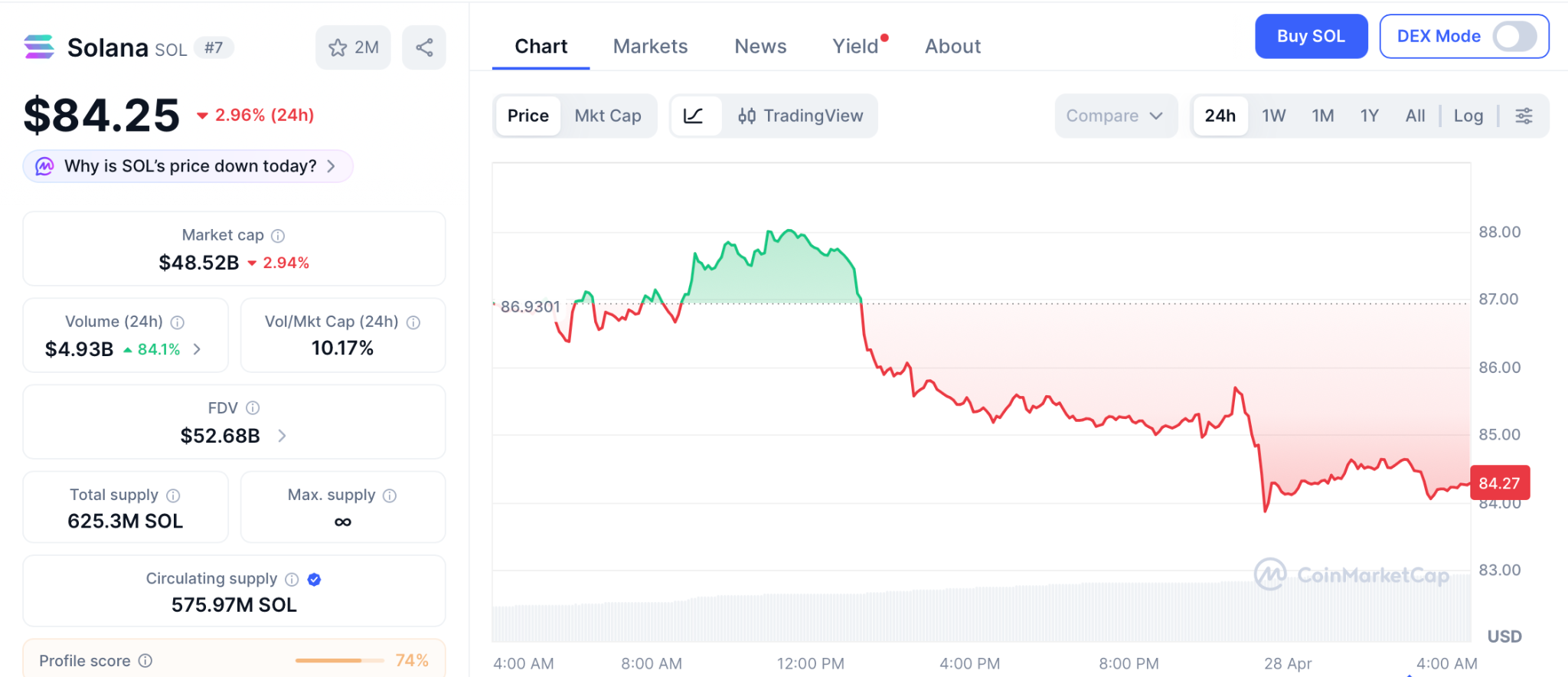 Solana (SOL) trades at $84.25 per CoinMarketCap, recovering from April lows near $80 after AAVE launched natively on the network through Sunrise DeFi.