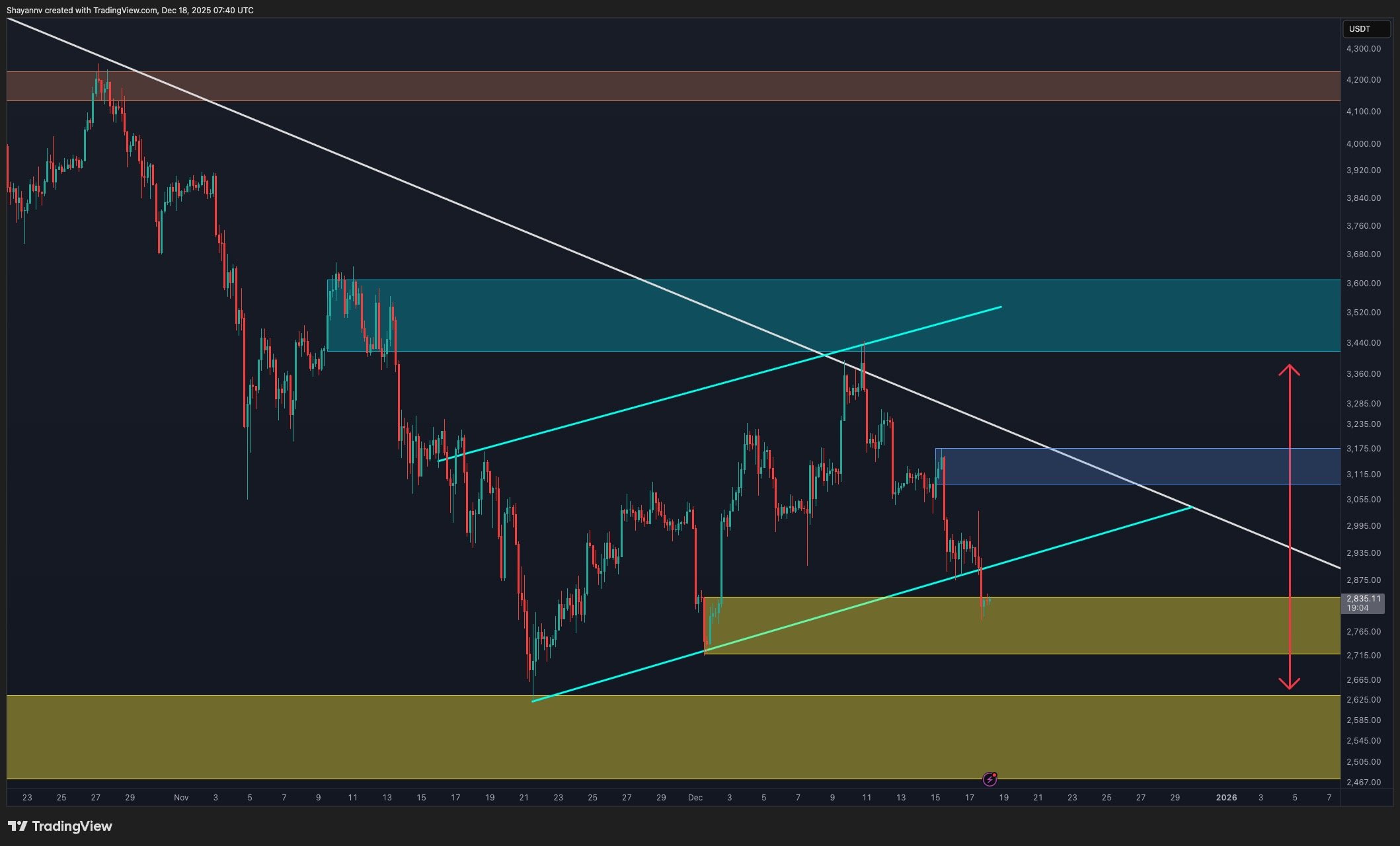 The nearest overhead supply sits around the $3.4K to $3.6K region, where previous breakdowns occurred and where the descending trendline intersects with prior consolidation. As long as Ethereum fails to reclaim and hold above this zone, downside continuation remains a valid scenario. Below current levels, the $2.6K to $2.8K region represents the first meaningful demand zone, but structurally it appears more like an intermediate pause rather than a definitive cycle low.