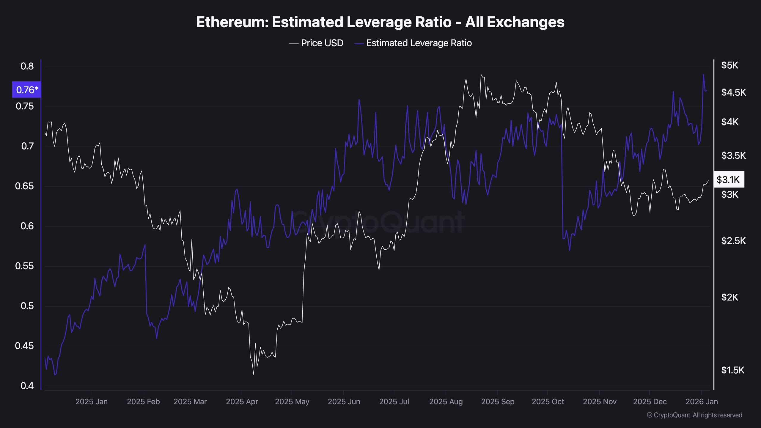Ethereum’s leverage ratio on Binance has reached an unprecedented high of 0.8, surpassing the previous peak in December. This surge reflects growing trader confidence and increased market fragility.