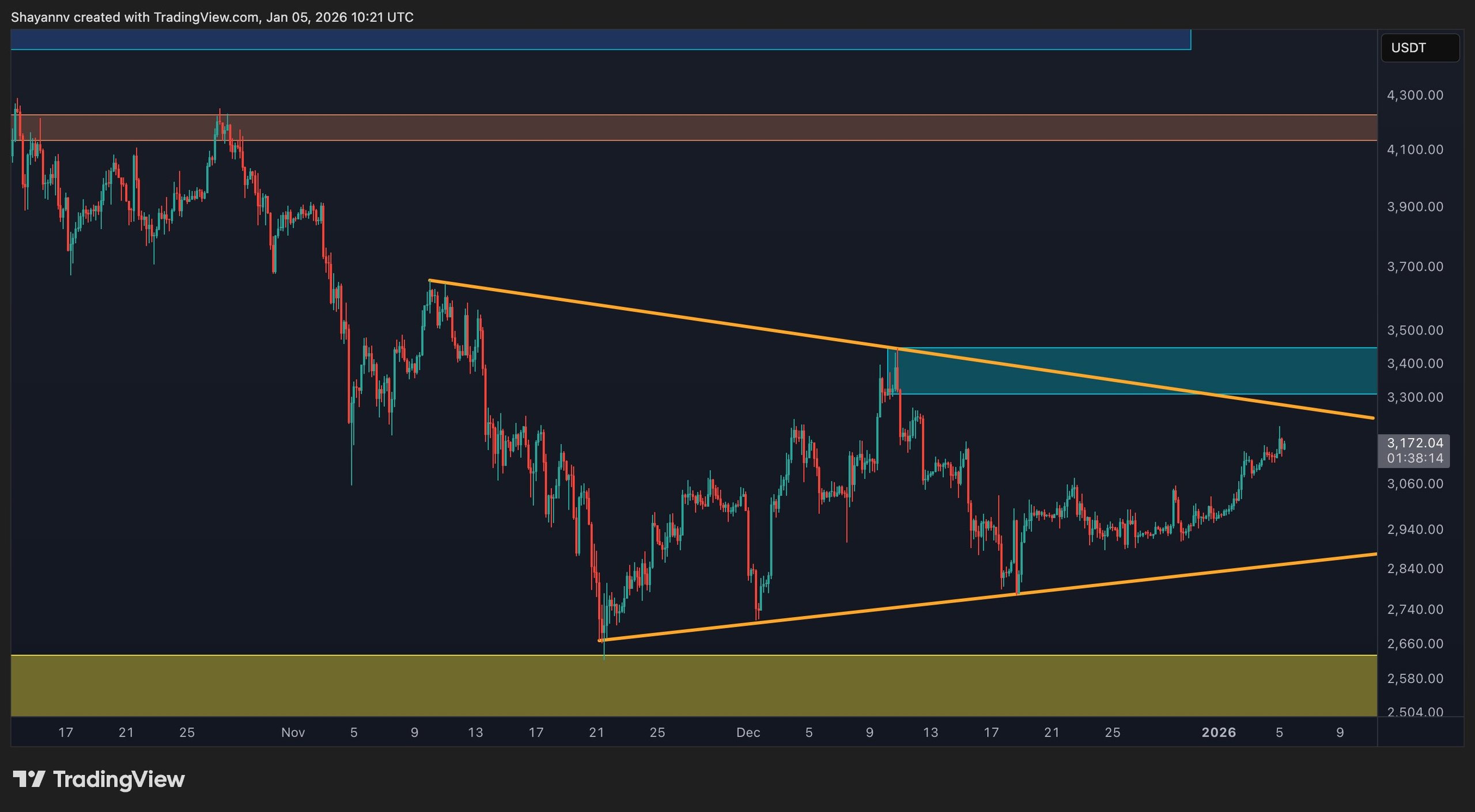 This consolidation alone is not sufficient to signal a bullish continuation. A decisive breakout above the wedge at $3.4K, ideally with strong displacement and acceptance, would be needed to confirm renewed bullish momentum. Until that occurs, the current price action should be treated as range-bound and corrective, with the risk of another rejection remaining elevated if resistance continues to hold.