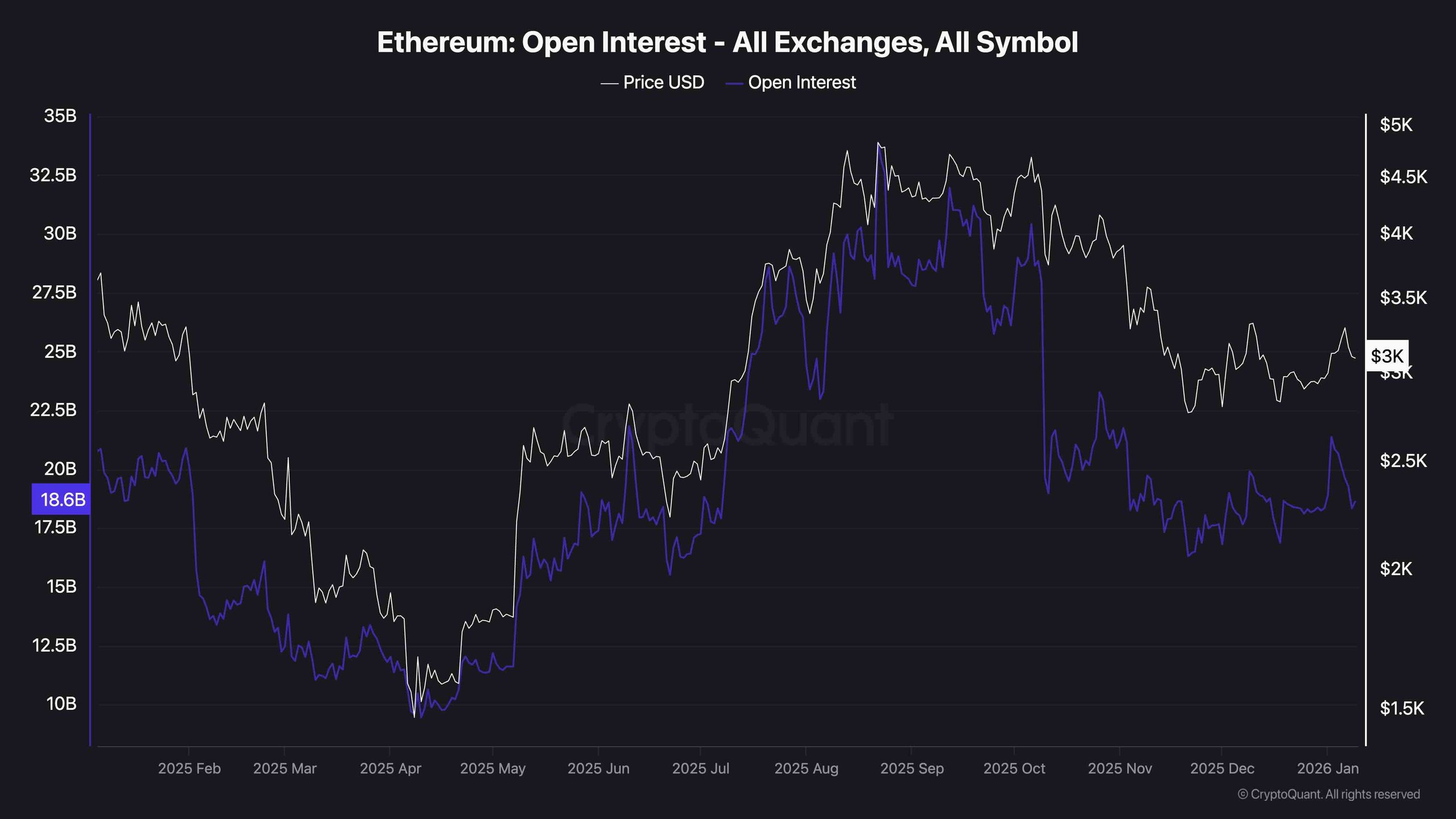Looking at the Ethereum open interest chart across all exchanges, we can see that OI remains around $18B, although down from its Q3 2025 peak. This suggests that traders are still actively participating in the market, but without signs of overwhelming leverage. The recent price rebound from December lows did not trigger a surge in OI, which could be seen as healthy, as there will be less likelihood of forced liquidations if volatility returns.