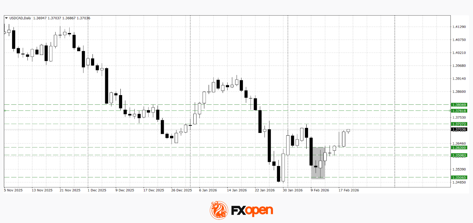 USD/CAD has also rebounded from the January lows and formed a bullish reversal pattern. The pair is currently approaching the key resistance level at 1.3700. If buyers manage to secure a firm break above this level in the coming sessions, further gains towards 1.3730–1.3800 are possible. Conversely, a move below 1.3630–1.3590 could open the way for a retest of the 1.3500 area.