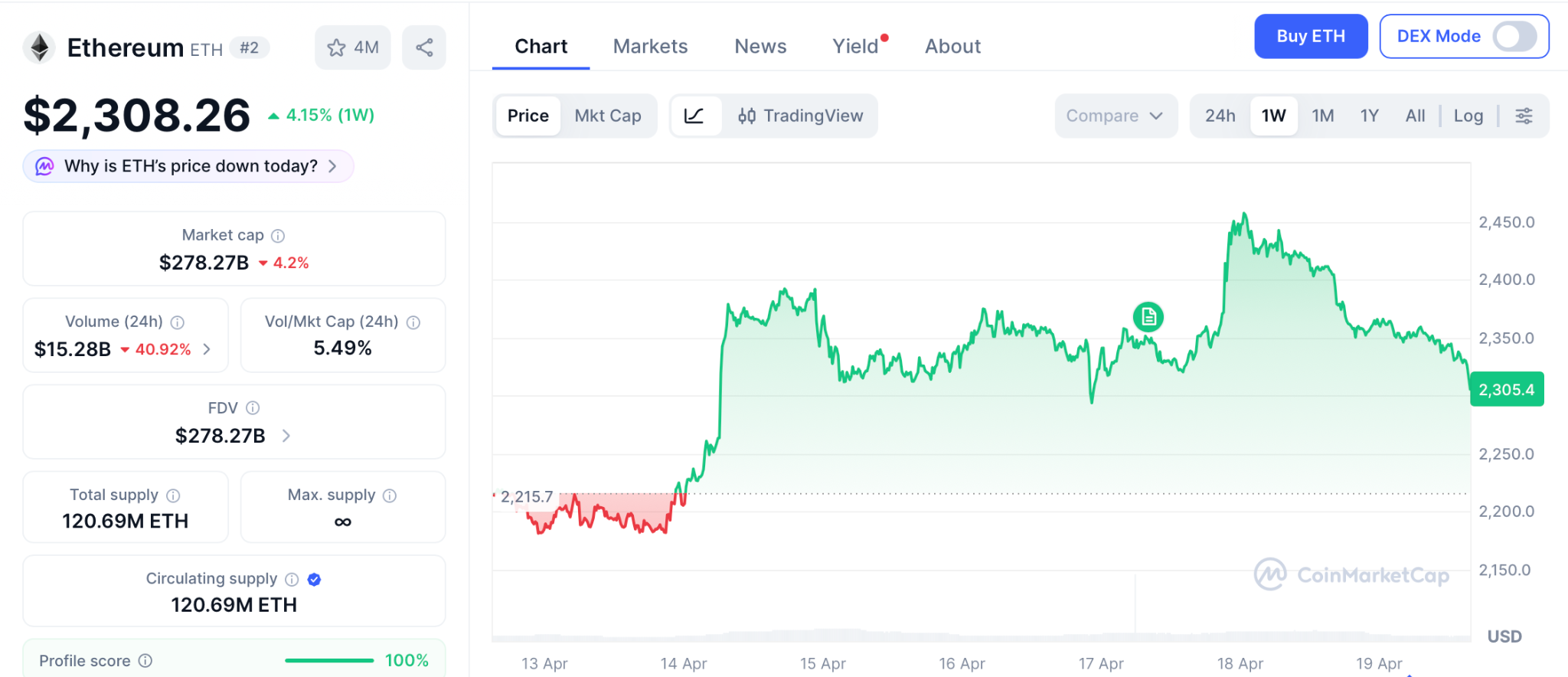 The big Ethereum price news this week is Schwab opening spot ETH trading for retail clients, putting ETH directly inside one of the largest traditional brokerage platforms in the United States, per Blockonomi. The launch dropped on April 17 while the token pushed past $2,308, up 1% on the session and up over 4.15% on the week after Ethereum ETFs pulled in $127.4 million of net inflows in a single trading day.