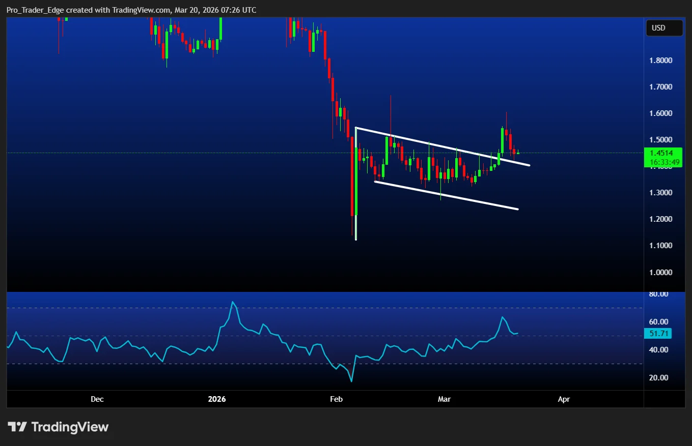 The critical support region resides in the mid-$1.40 area, which aligns with the 20-day exponential moving average. Should XRP maintain levels above this threshold, the bull flag’s projected upside target reaches approximately $1.70–$1.72, representing roughly 20% upside potential from present levels.