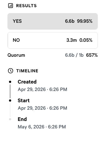 Onlookers noted that the vote passed within minutes, and that by the 15-minute mark, it had achieved 1.5 billion votes and passed with a 148% Quorum, beating its May 6 deadline.