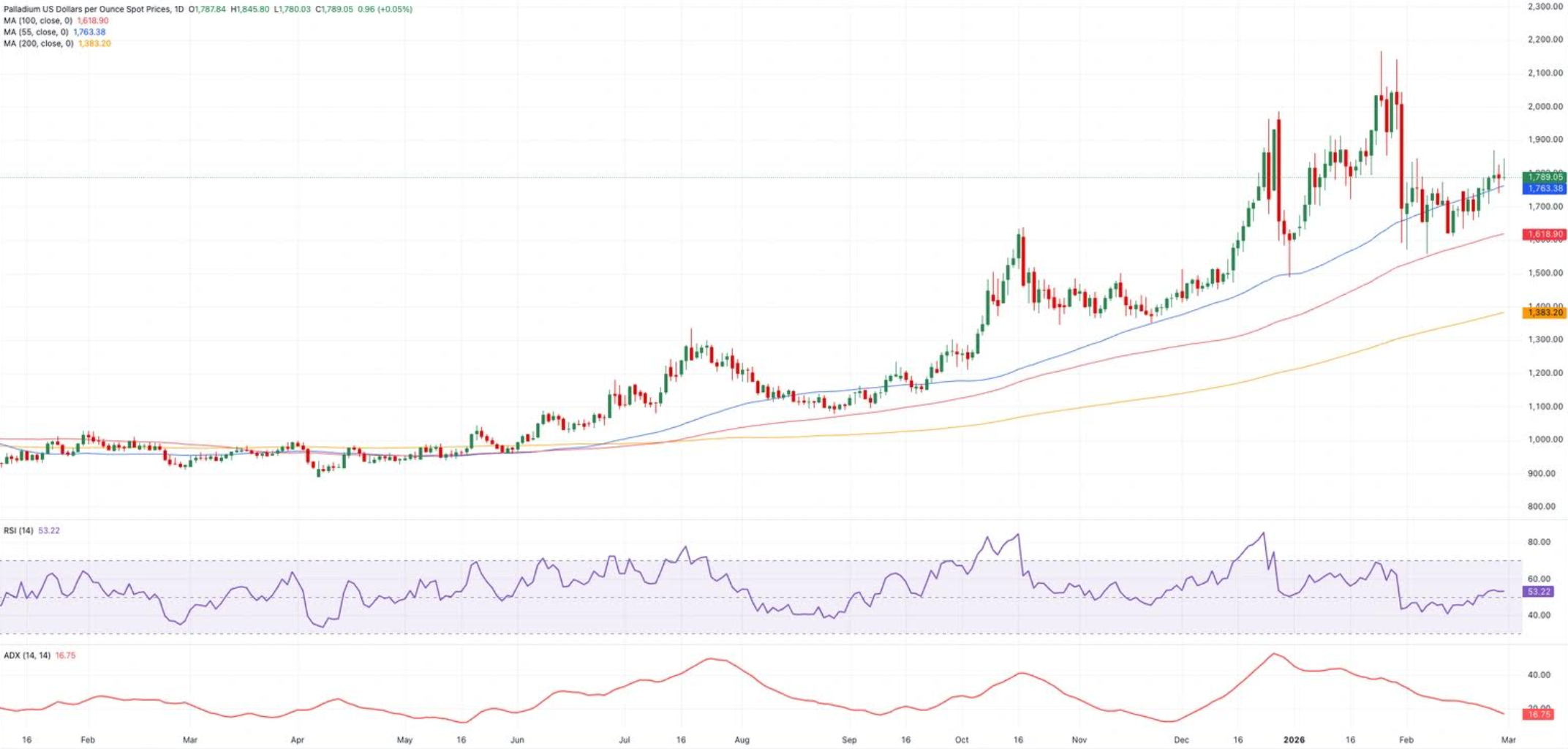 After a big jump, Palladium has settled into a holding pattern around the $1,750-$1,800 area on the daily chart.