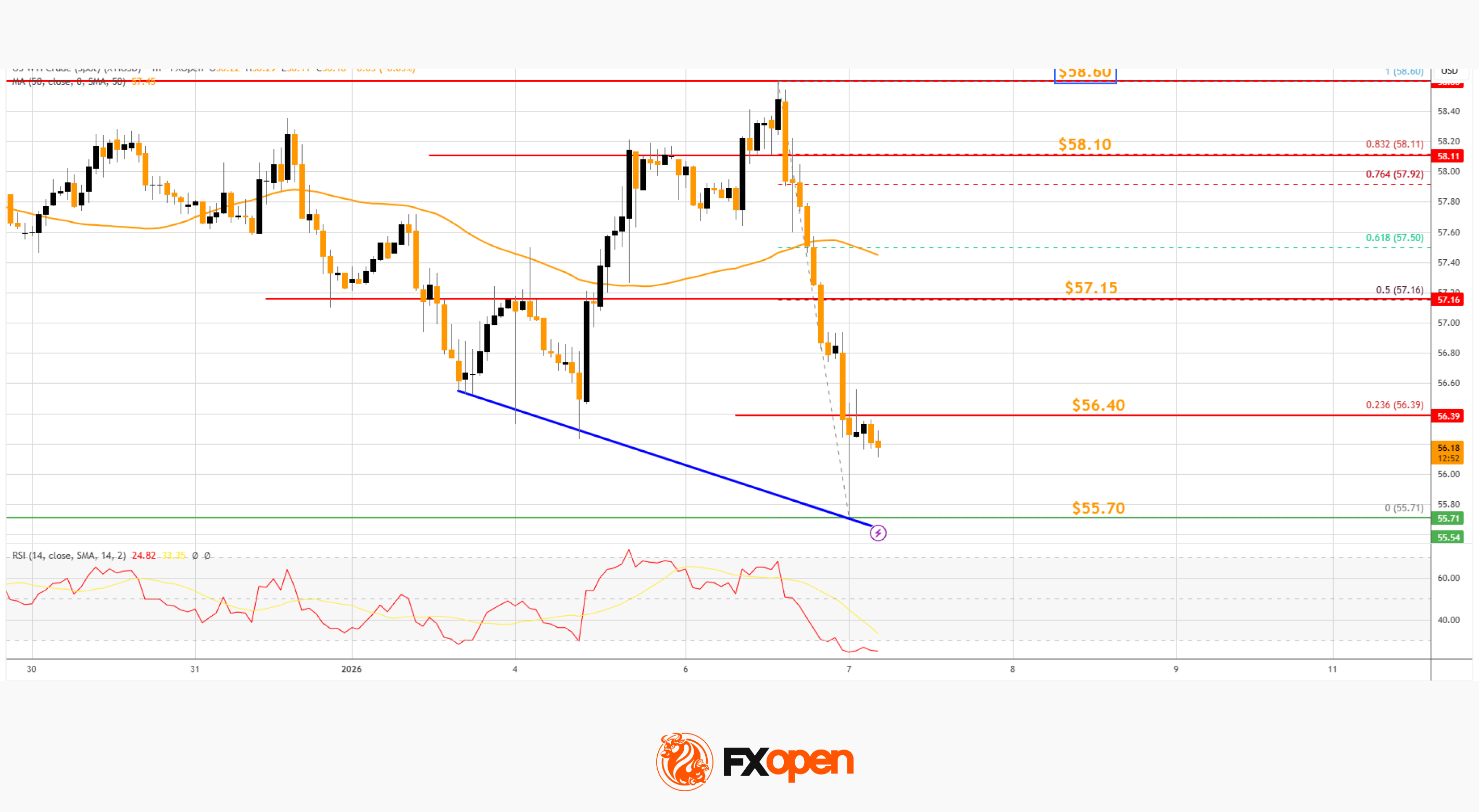 On the hourly chart of WTI Crude Oil at FXOpen, the price struggled to clear $58.60 against the US Dollar. The price started a fresh decline below $58.00.