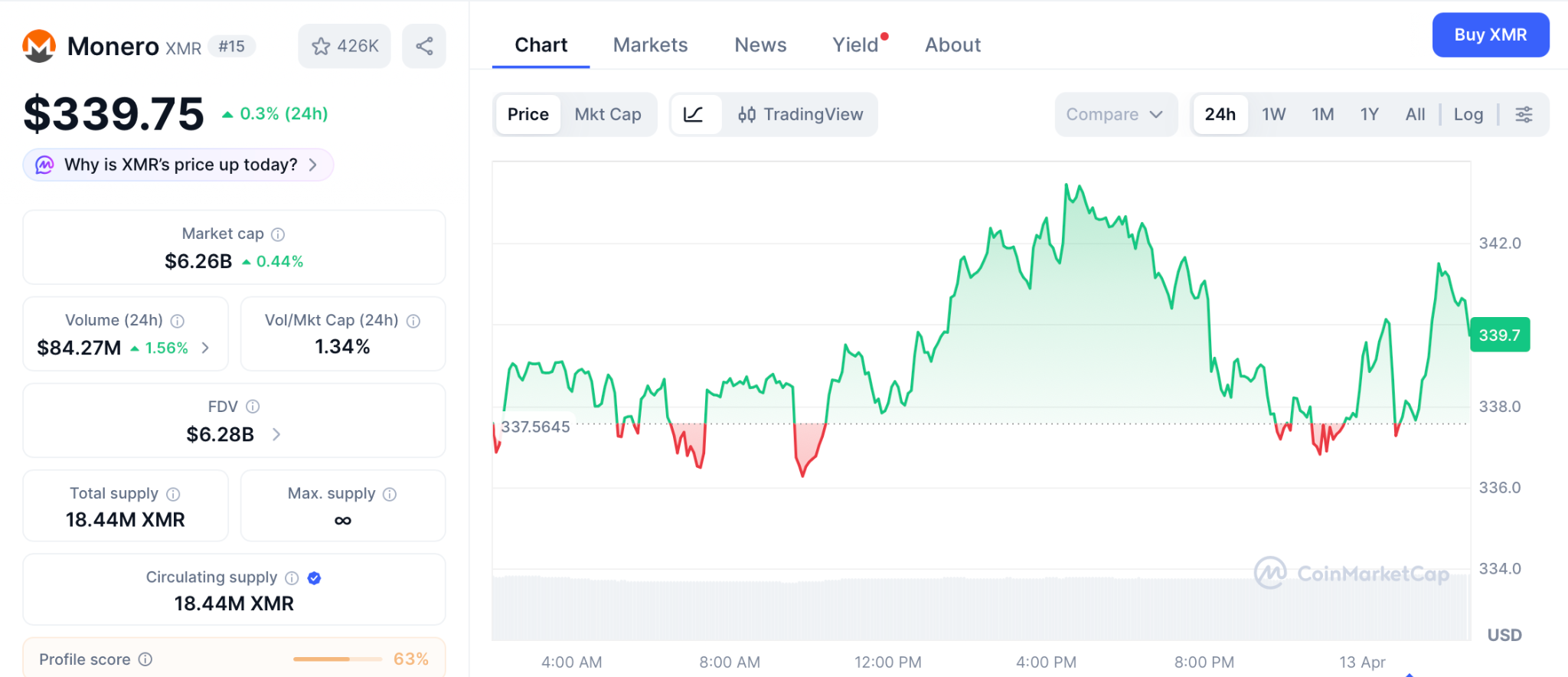 XMR trades near $339 with a $6.2 billion cap, sitting 57% below its January 2026 all time high of $798 per CoinMarketCap.