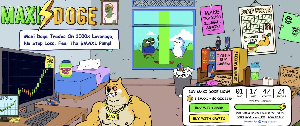 Maxi Doge ($MAXI) is currently the presale generating the most discussion in that context. Built on Ethereum as an ERC-20, the project has raised $4,748,137.43 at a current price of $0.0002814 — closing in hard on the $5M milestone.