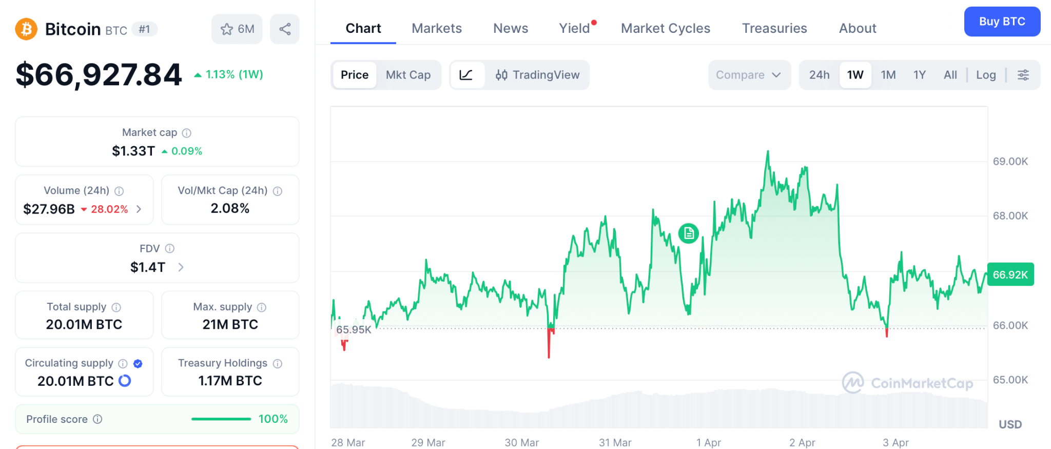 BTC Holds $66,927 as Institutional Capital Builds Slowly