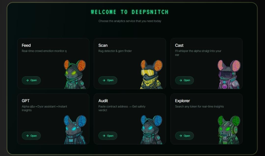 This dashboard organizes the ecosystem into six accessible areas: Feed, Scan for finding gems and detecting rug pulls, Cast, GPT for interactive research, Audit for instant contract safety verdicts, and Explorer.