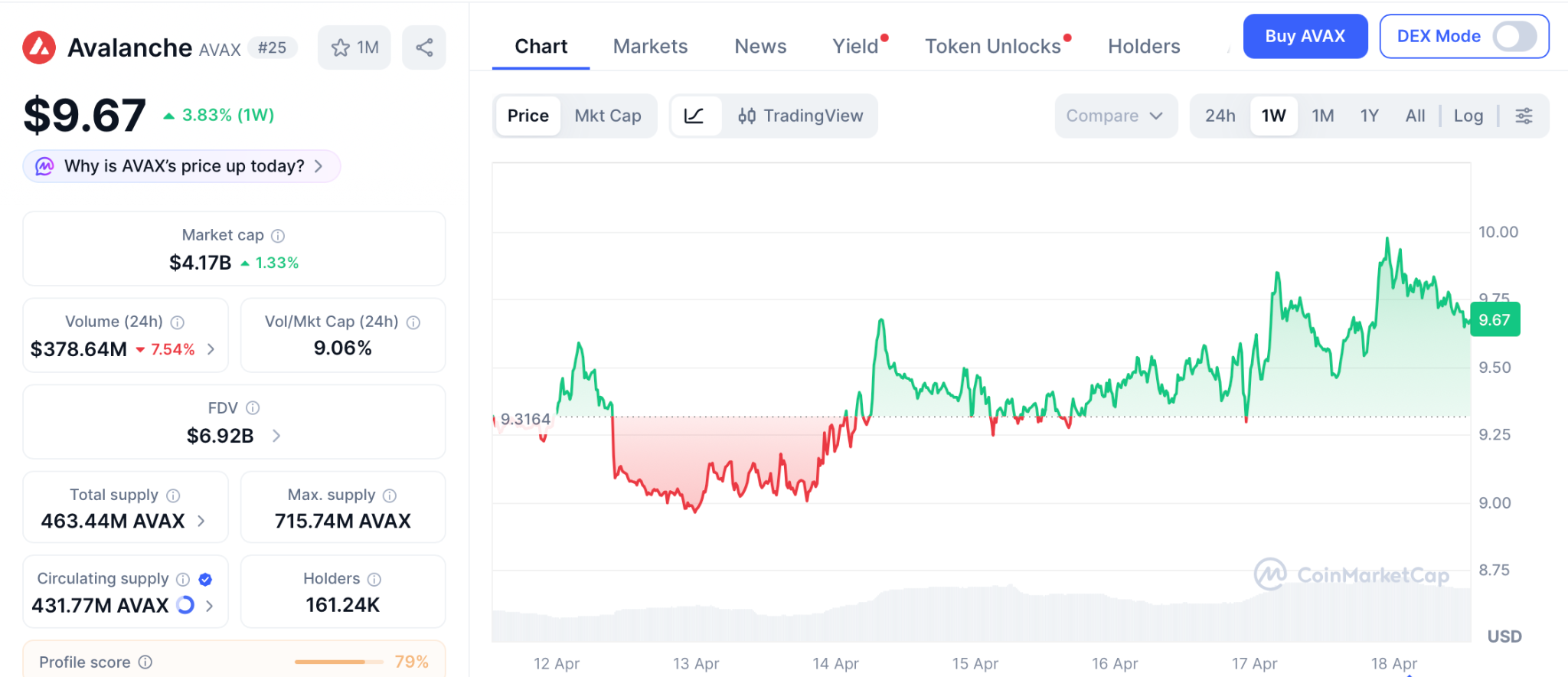 Avalanche (AVAX) holds $9.67 per CoinMarketCap with $4.17 billion in market cap and the spot AVAX ETF (VAVX) live since January with staking baked in. NHN KCP signed the payments L1 MOU on April 14, RWA TVL on Avalanche doubled to $2.1 billion since April 2025, and 80+ subnet chains run on the network.