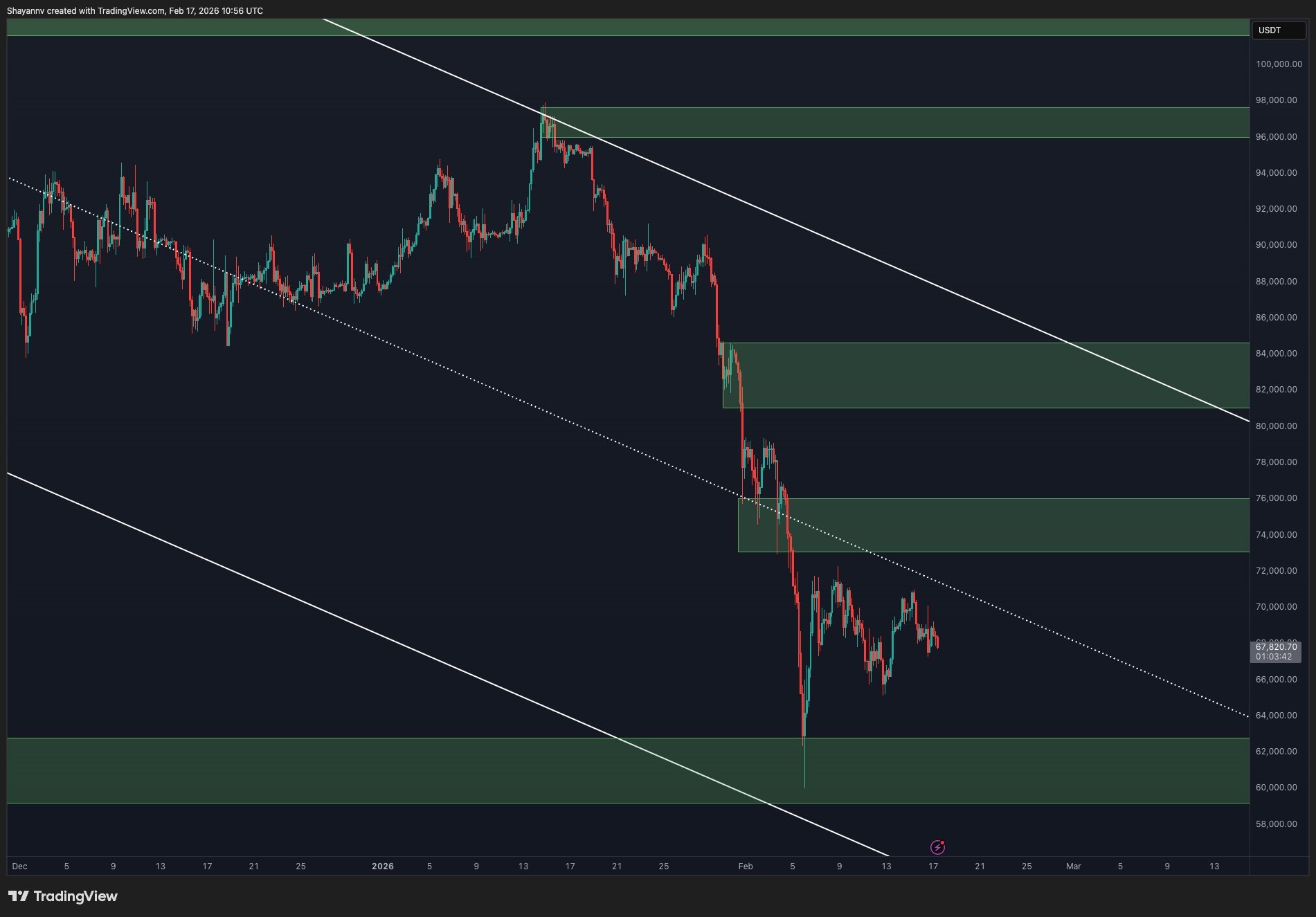 On the daily timeframe, the asset is still trading within a well-defined descending channel, with both the upper and lower boundaries clearly guiding the macro structure. After losing the $79K level and breaking decisively below the $75K range, Bitcoin accelerated toward the major blue demand zone around $60K, where a strong reaction occurred.