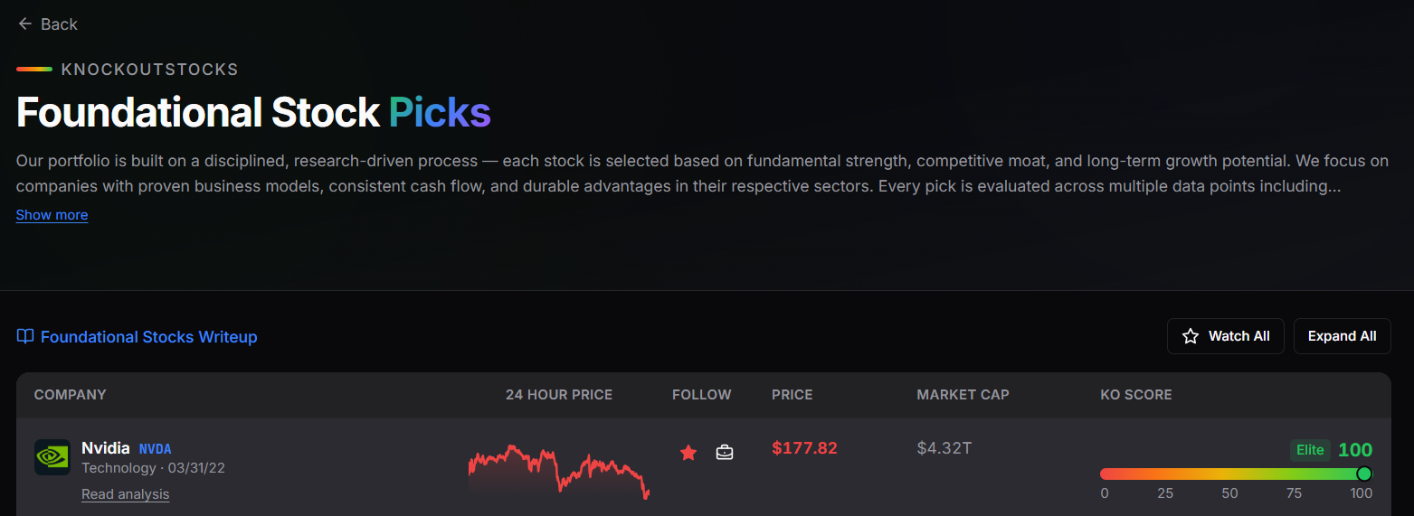 KnockoutStocks delivers a carefully selected, high-conviction stock portfolio personally chosen by its research professionals. Every selection earns inclusion through meticulous research, sector examination, and practical investment rationale grounded in fundamental strength, sustainable competitive advantages, and long-term growth capacity.