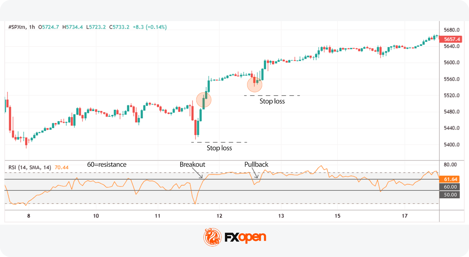 To identify the trend, traders consider support and resistance levels. In an uptrend, the 40-50 zone serves as support. In a downtrend, the 50-60 range acts as resistance.