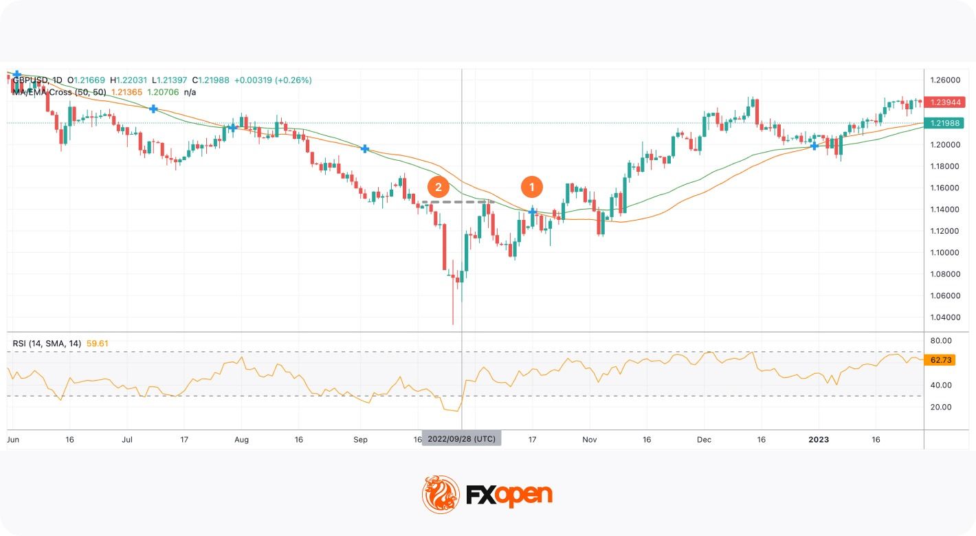 On the chart above, the RSI broke above the 30 level on 28th September. A trader could go long, using a trailing take profit. After the MA/EMA cross occurred (1), a trader could trail the take-profit target. Another option would be to place the take-profit order at the closest resistance level (2) and wait for the cross to confirm the reversal signal. After the confirmation, a trader could open another buy position and drive the uptrend.