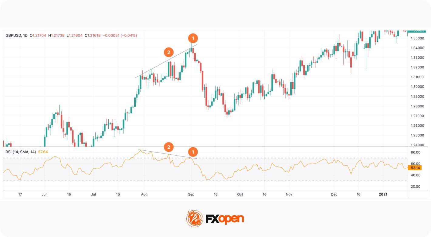In the RSI example chart below, the indicator and the price formed a regular bearish divergence. As a result, the price fell (1). There was another divergence before the fall, but the price decline was short-lived (2). This highlights risks associated with the incorrect signals the RSI divergence may provide.