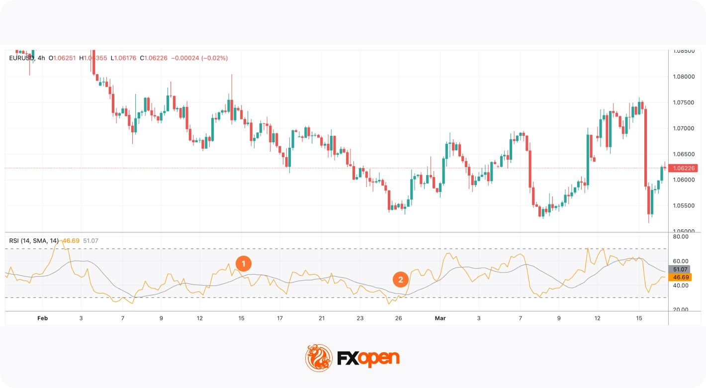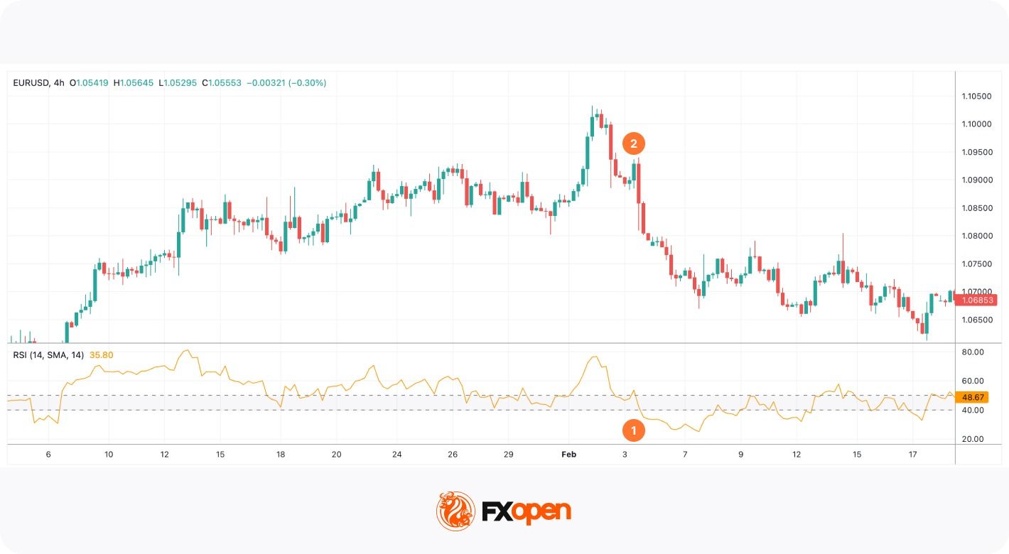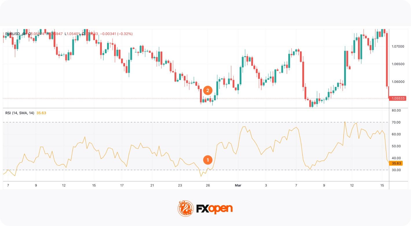 In the chart above, the RSI trading indicator broke below 30, left the oversold area, and retested the 30 level (1). At the same time, the price formed the bottom, and the downtrend reversed upwards (2).