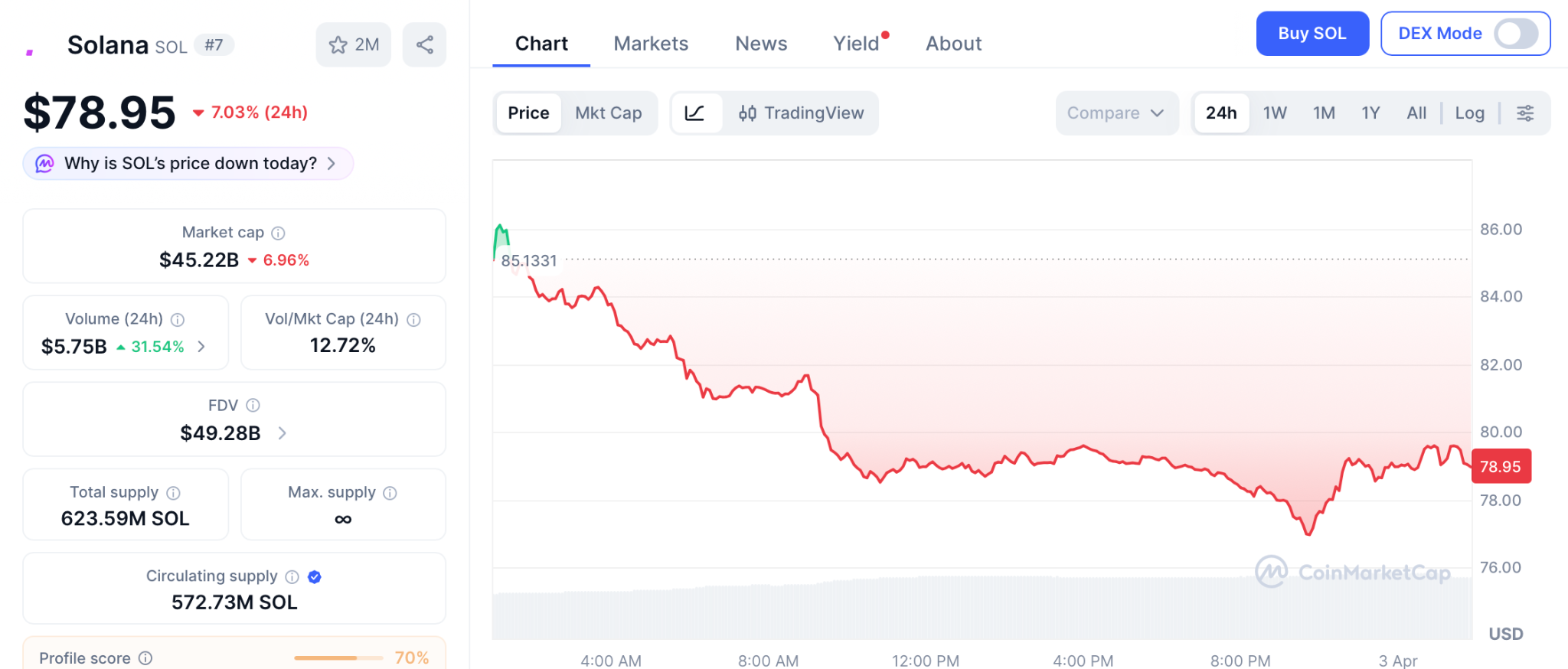 Solana currently trades at $78.95 after today’s sharp drop, a drop that hit all of the crypto market due to the current geopolitical situation according to CoinMarketCap.