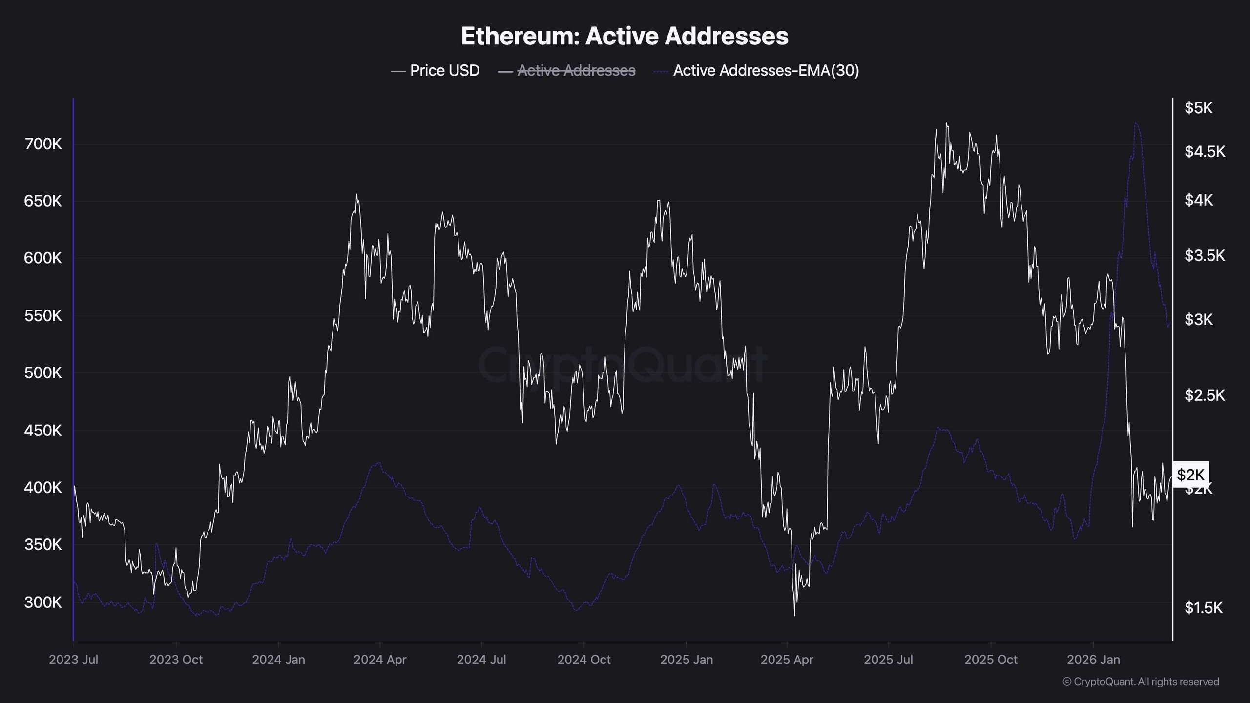 The active addresses chart paints a more nuanced picture than pure price action. Network activity expanded aggressively into the recent period, which suggests Ethereum was still seeing solid user engagement even as the market structure weakened. That kind of divergence can be important because it shows the chain itself did not completely lose participation during the drawdown.