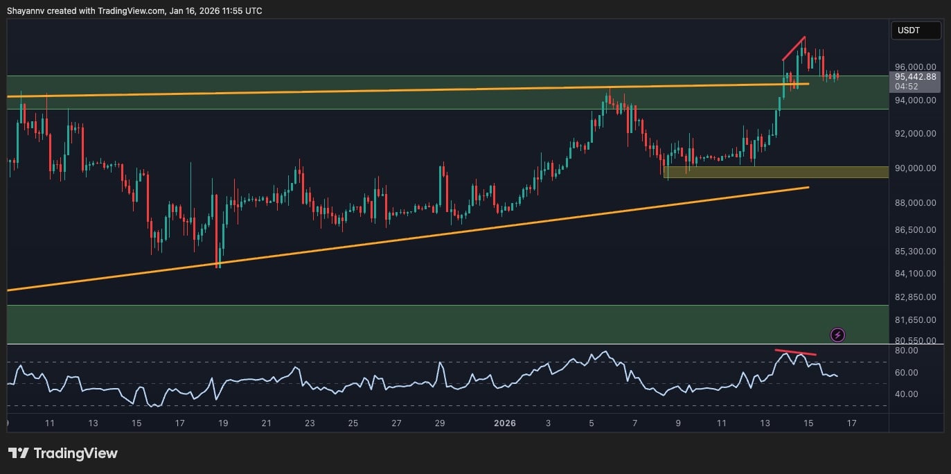 If buyers fail to defend the breakout area around $93K–$94K, a pullback toward the lower trendline of the pattern and the $90K region would be probable. Conversely, if BTC can hold above $93K–$94K and build a base there, another push toward the $98K–$100K psychological level becomes realistic. Yet, buyers need quick follow-through, or the breakout risks turning into a fakeout.