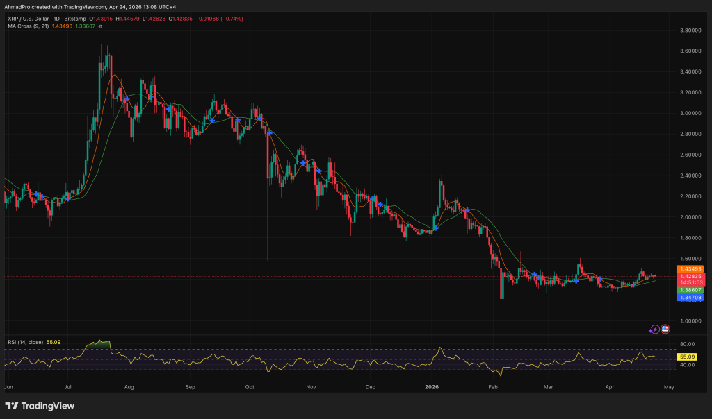 XRP is sitting at $1.428 on the daily chart, and the most interesting thing happening right now is that the 9 and 21 MA are crossing bullish for the first time since the August peak, with price sitting just above both moving averages after months of trading below them.