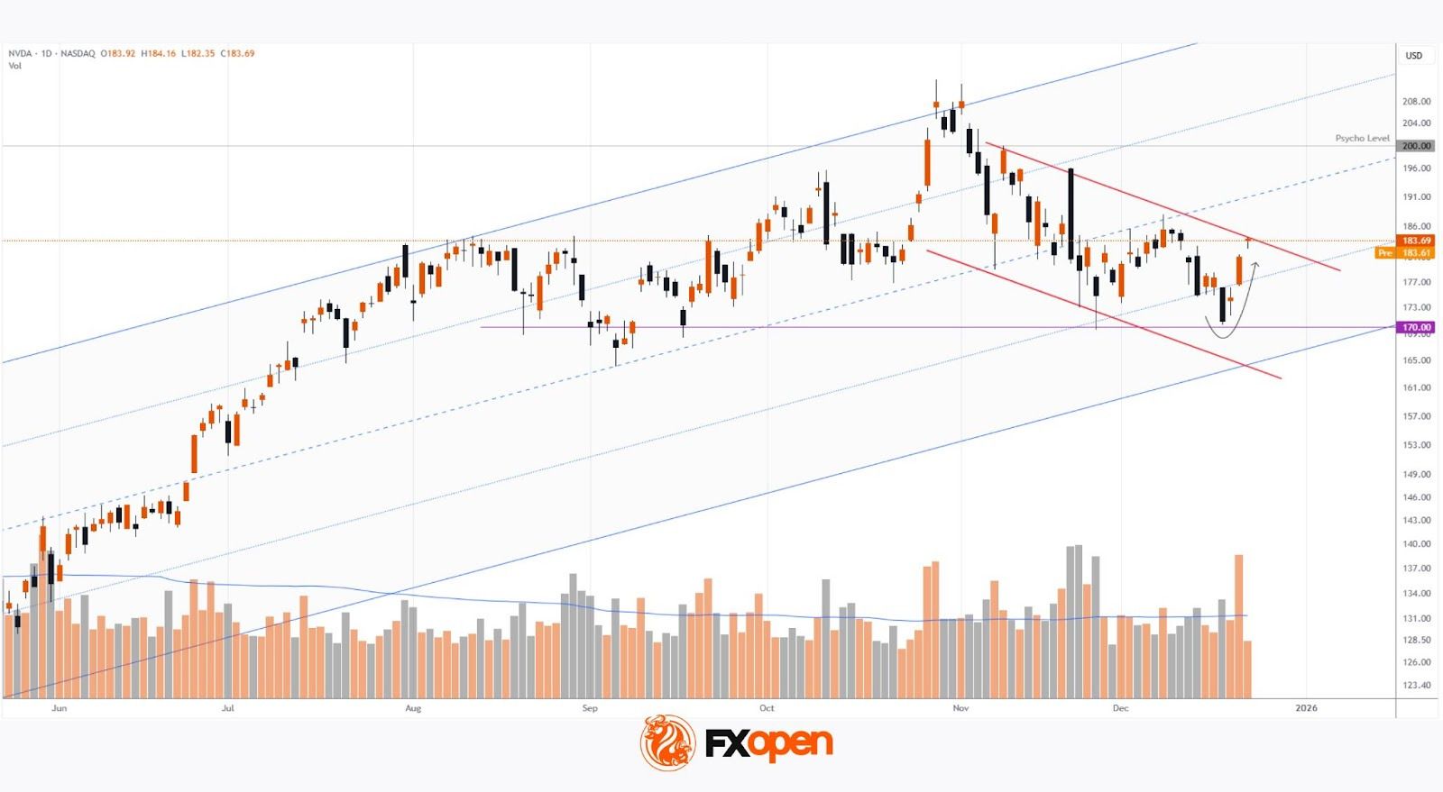 → the price reversed higher (as indicated by the arrow) before reaching the lower boundary of the channel, with the $170 level acting as support;