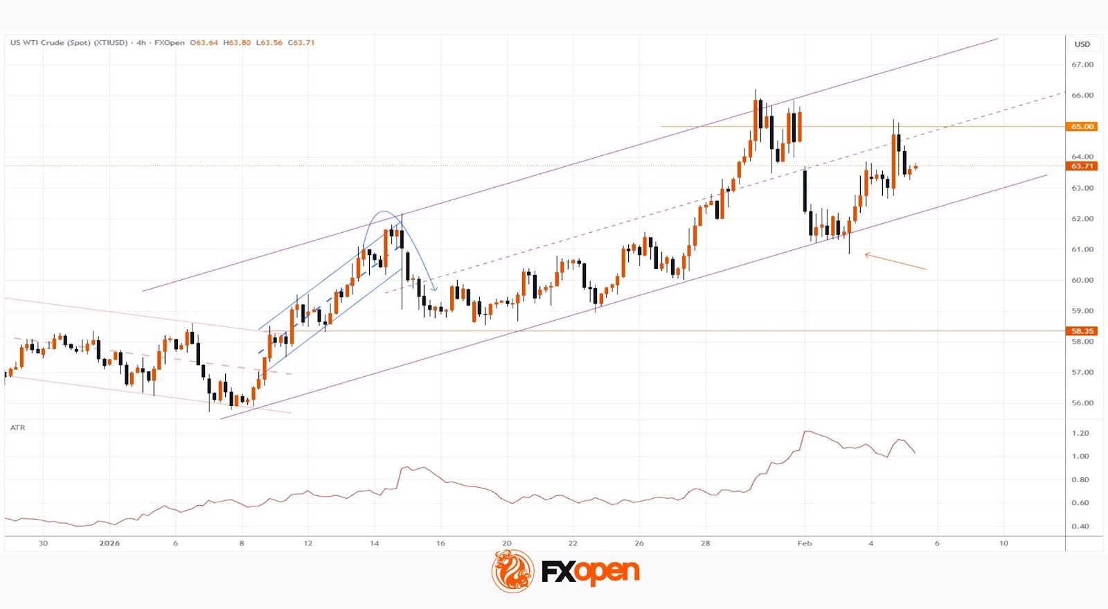 → the $65 level appears to be a key resistance. Broad price swings formed there on 29–30 January — a sign of “smart money” activity — after which prices declined. Yesterday, the market again reversed sharply from this level.