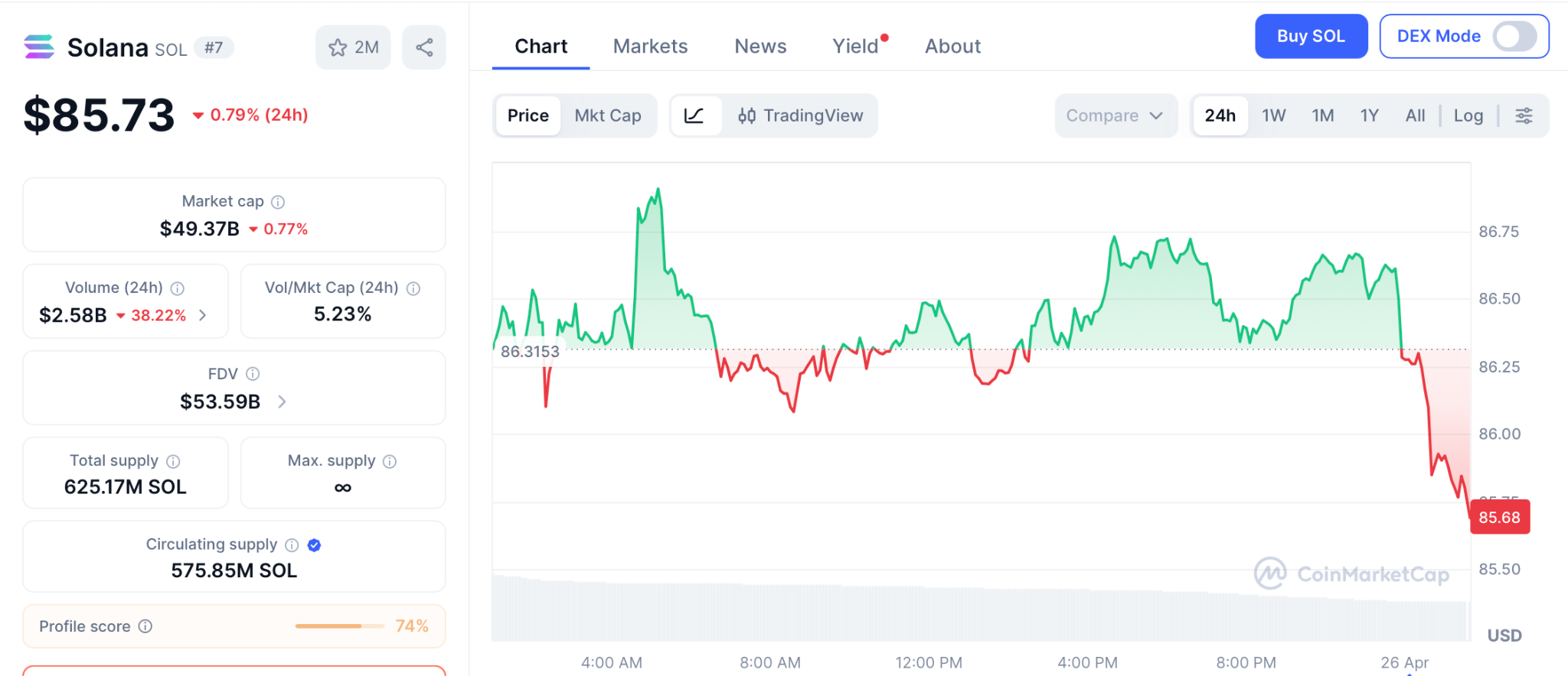 Solana (SOL) trades at $85.73 according to CoinMarketCap, up 0.92% after Anchorage Digital opened institutional staking through Marinade and the weekly MACD printed its first bullish crossover since the 2022 cycle bottom.