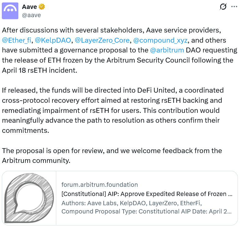 In a governance proposal posted on Saturday, Aave Labs argued that releasing the frozen Ether to DeFi United would “restore normal conditions for Arbitrum users” and the broader ecosystem, noting that rsETH’s backing represents a meaningful contribution toward stabilizing the stablecoin’s value after the incident.