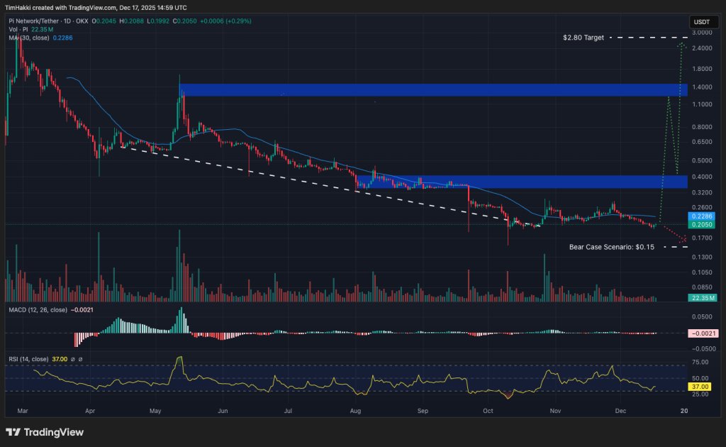 According to Perplexity AI, Pi faces two extreme outcomes. In a negative scenario, the model warns PI could fall all the way to $0.15. Conversely, under strong bullish conditions in December, PI could surge toward $2.80, representing a potential upside of more than 1,279% from current levels.