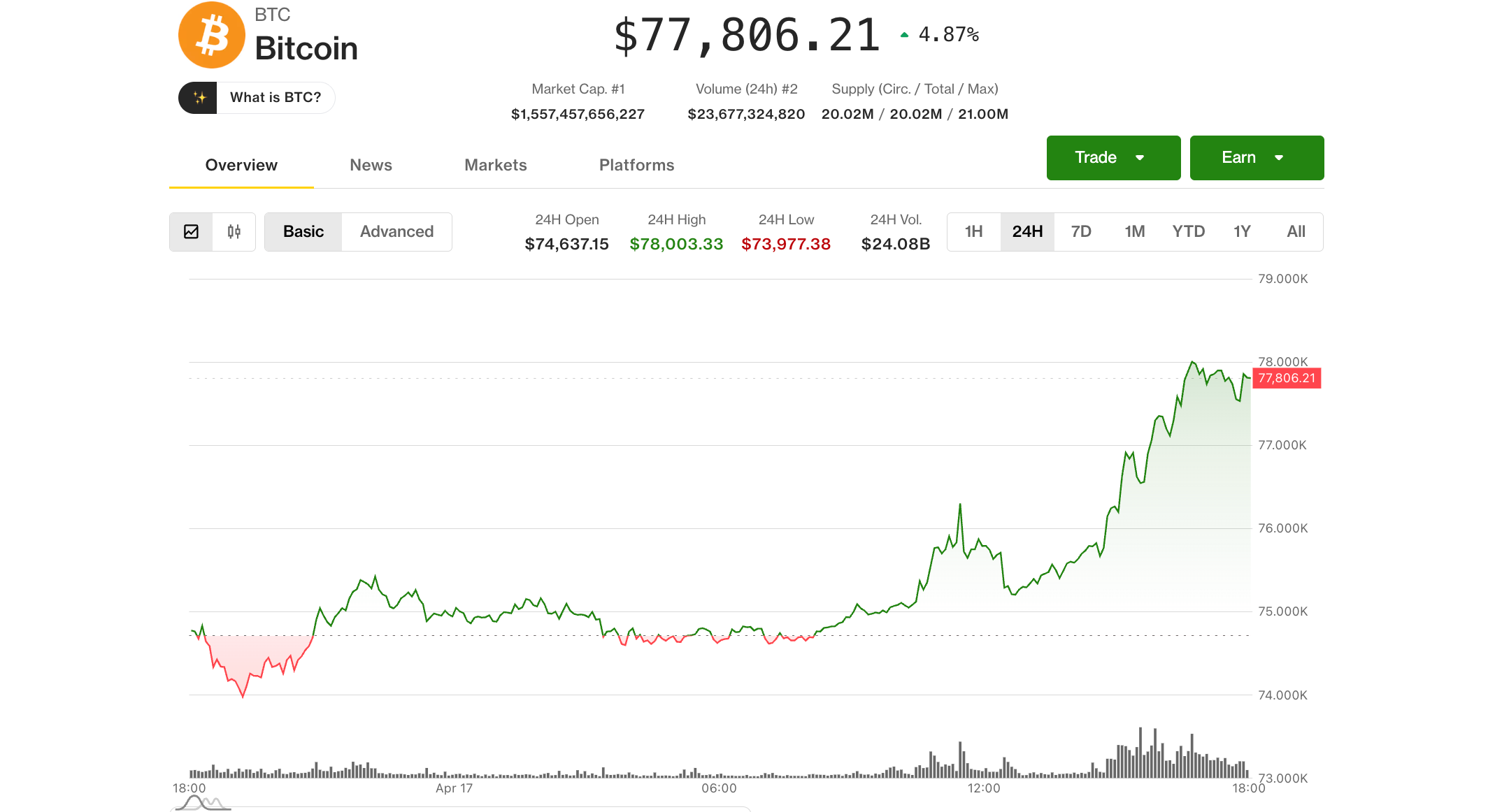 Bitcoin climbed to $78,000, breaking out from a two-month range that capped prices since early February and up nearly 5% over the past 24 hours.