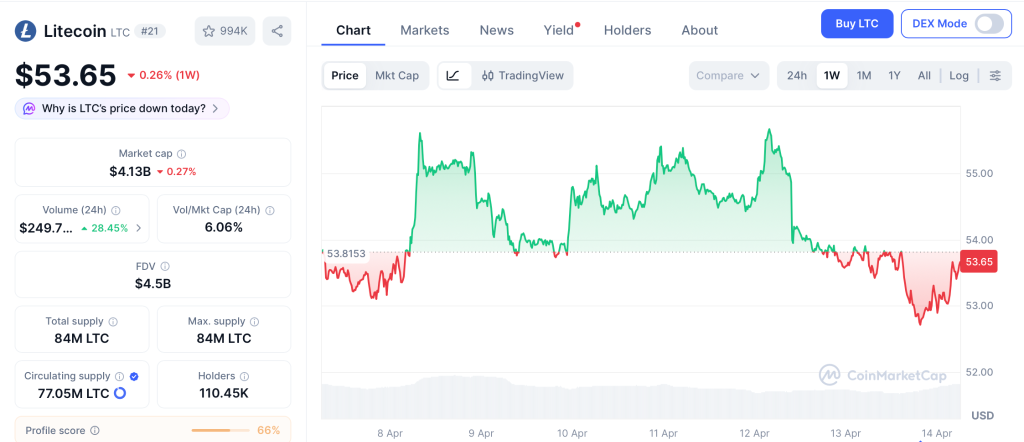Litecoin (LTC) holds $53,65 per CoinMarketCap, down 87% from its $410 all time high despite earning official commodity classification. Trading volume dropped 33% over the past month.
