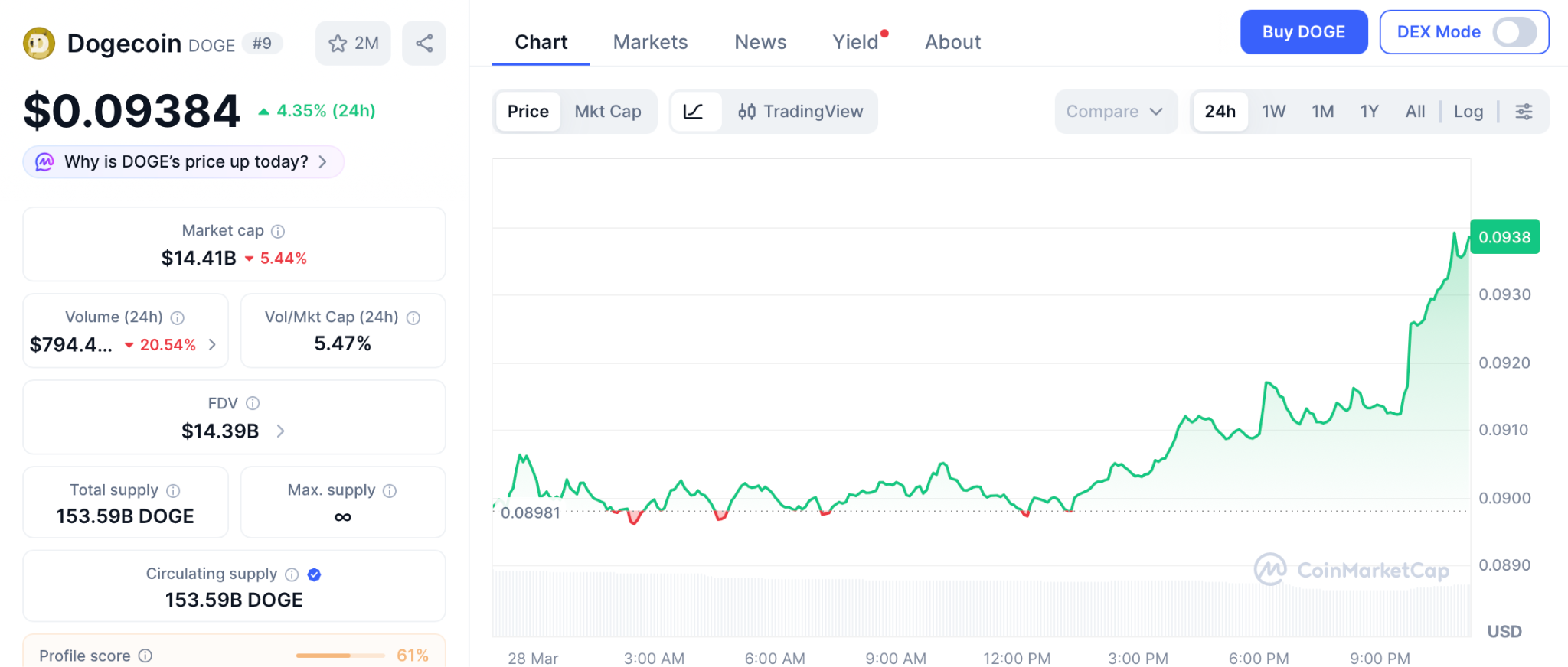 DOGE trades at $0.093 per CoinMarketCap, holding above key support as the meme sector waits for the next catalyst.