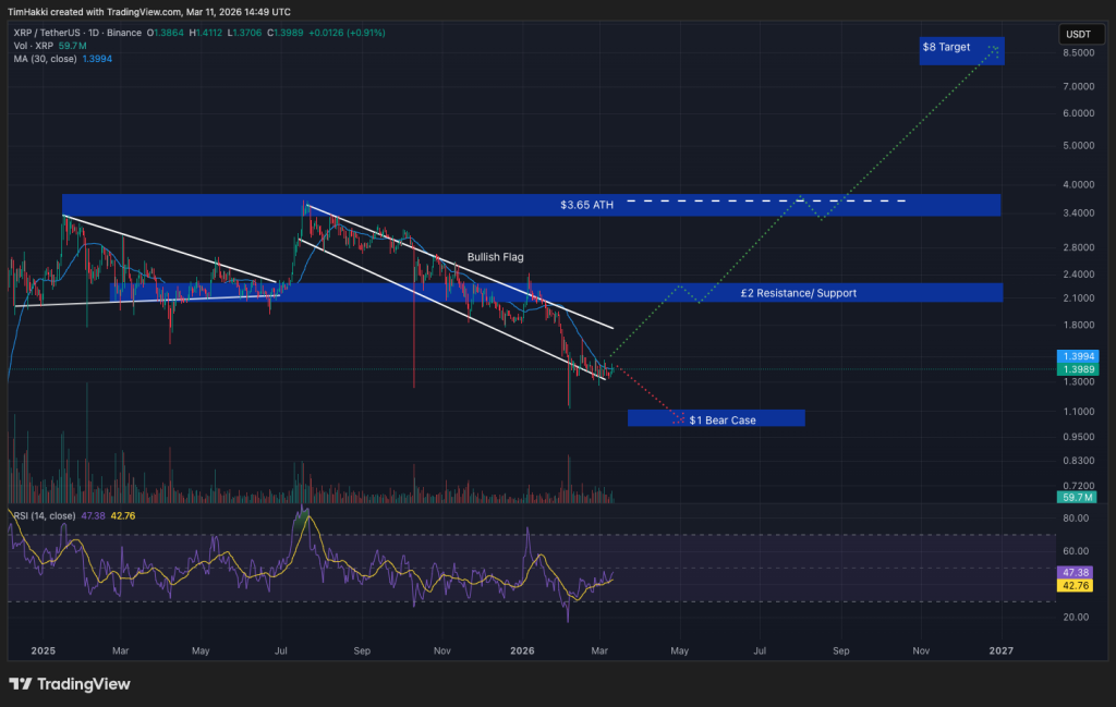 XRP is currently trading around $1.40, and DeepSeek suggests the asset could potentially rise toward $8 before year-end, producing gains of nearly 6x.