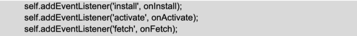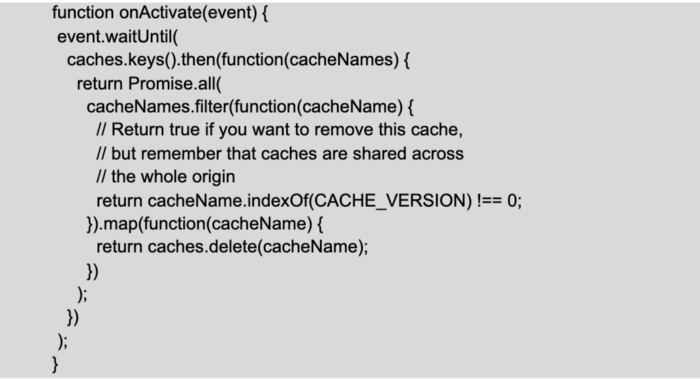 Secondly, we need to activate the service worker, i.e. tell the browser what is going to be the behavior when there is another legacy service worker or the cache needs to be cleaned up: