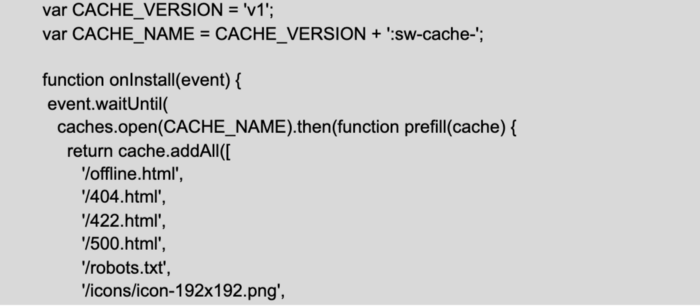 First of all, we need to configure the installation event. This event runs once when we are installing our PWA. The main purpose of this is to tell the browser what files are going to be offline: