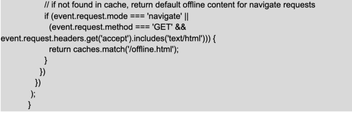 Thirdly, we need to configure the behavior when the application is offline, i.e. if the application is installed, the service worker verifies that some requests have been made before and can respond quickly or else it goes to the network: