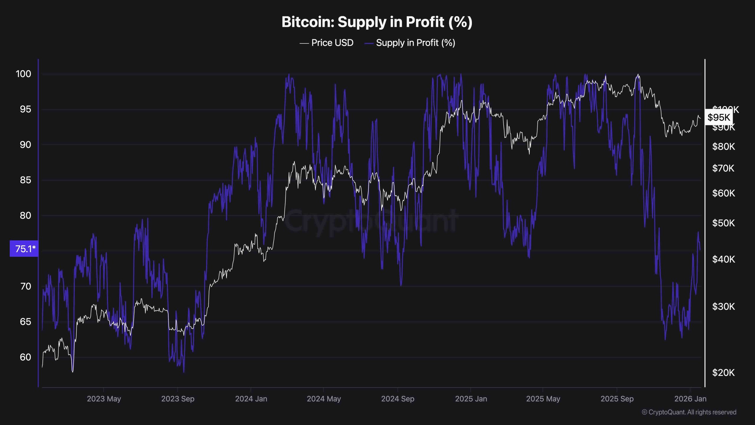 Bitcoin continues to consolidate just below a major resistance cluster after a strong recovery from the December lows. The price chart shows a clear sequence of higher lows, while on-chain data indicates that the percentage of supply in profit has undergone a deep reset and is now recovering.