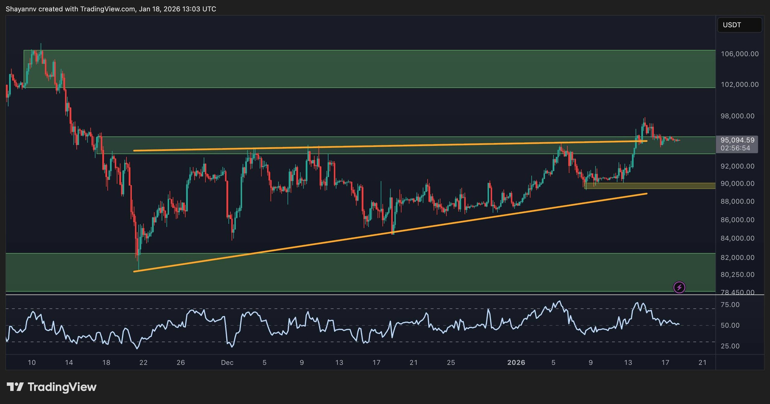 If such a correction unfolds, $93,000–$94,000 forms the immediate breakout-retest zone, where stability would preserve the integrity of the bullish breakout. Further below, the $90,000 region marks the prior consolidation band and mid-range support, a logical area for a deeper but still healthy pullback within the prevailing uptrend.