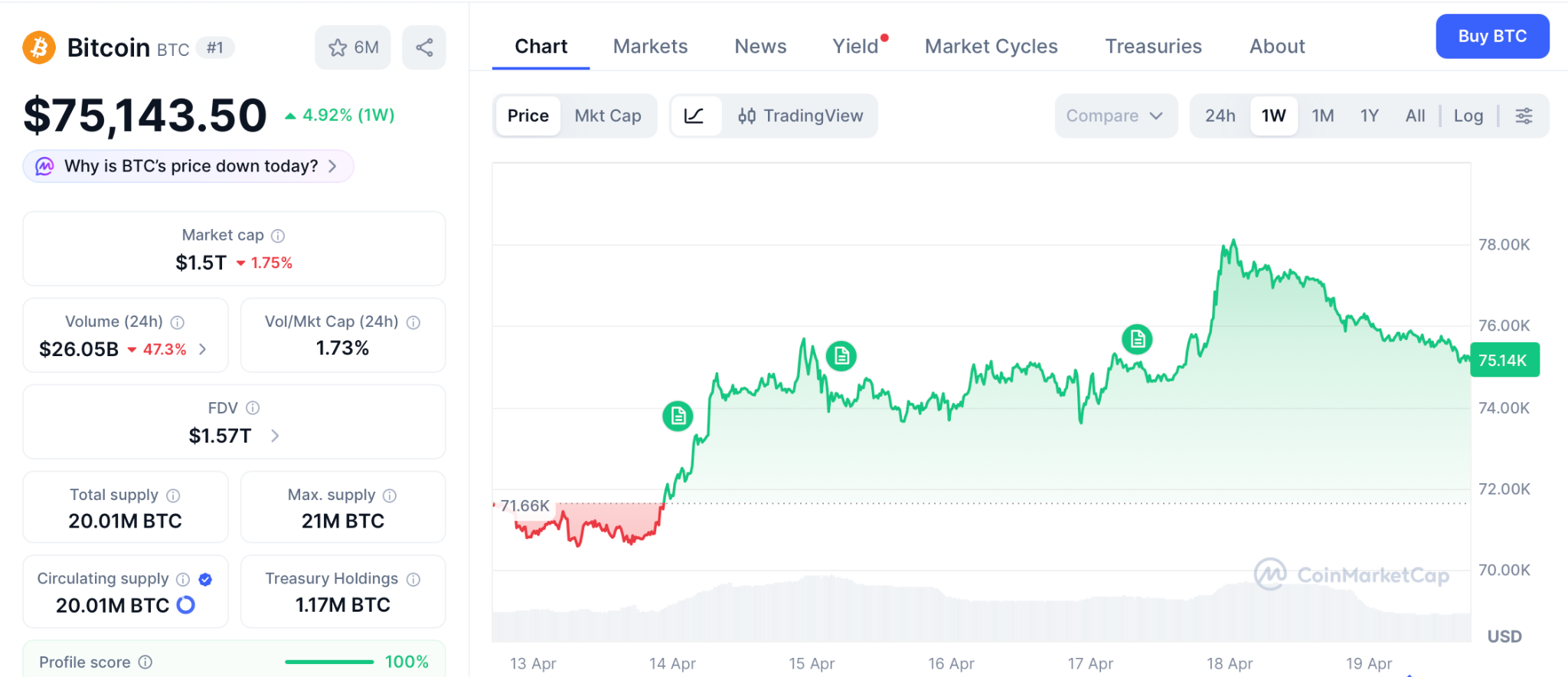 Bitcoin broke through $75.143 this week according to CoinMarketCap as the Iran tension eased and oil rolled over, and technicals now point at $80,000 as the next zone, per Intellectia analysis. BlackRock IBIT ended Q1 with $54 billion in assets and captured roughly $8.4 billion in net inflows for the quarter.