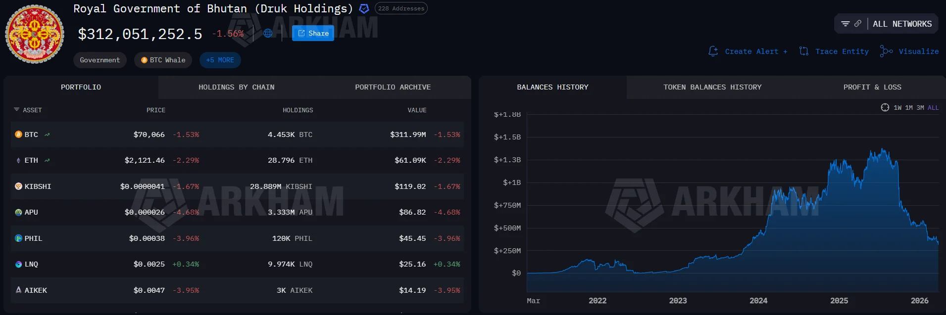 The Royal Government of Bhutan moved 519.707 BTC worth $36.75 million on Wednesday to an external address, according to Arkham Intelligence data. The transfer continues a drawdown that has intensified sharply over the past two weeks, with approximately $152 million in total outflows in 2026 alone.