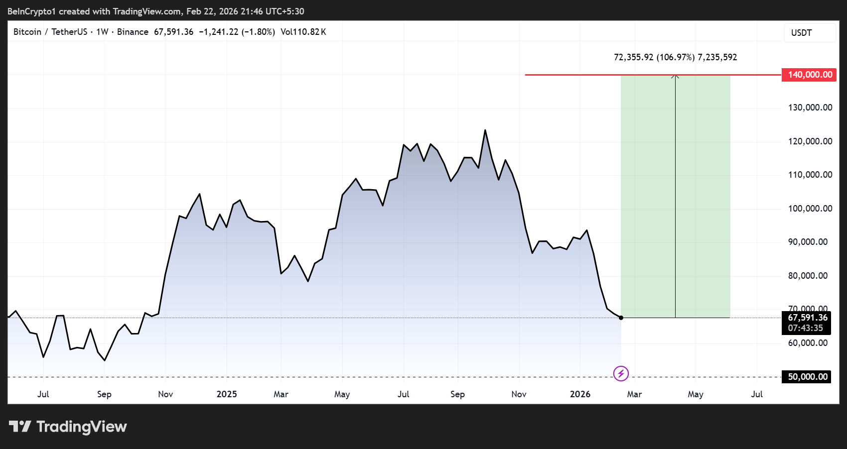 A move to $140,000 would represent a 106% increase in Bitcoin’s price from current levels.