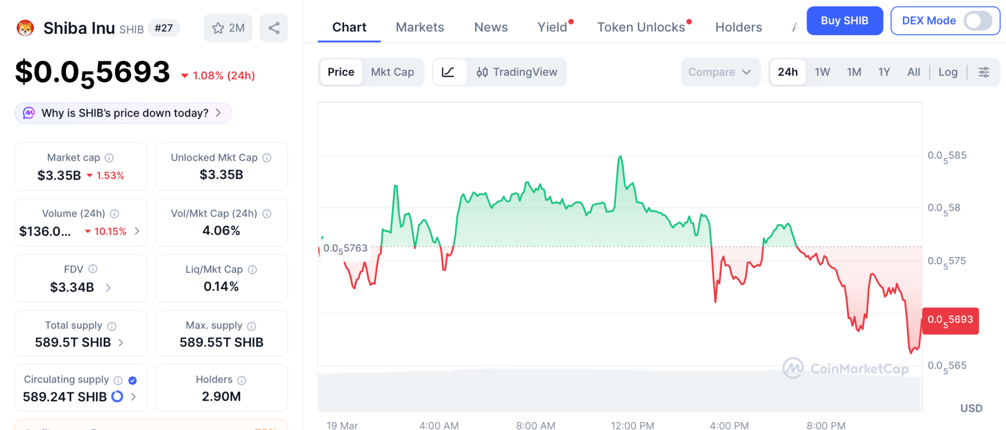 SHIB trades at $0.00000569, per CoinGecko, sitting 93% below its $0.00008616 ATH. Shibarium upgrades and the T. Rowe Price ETF filing add credibility.