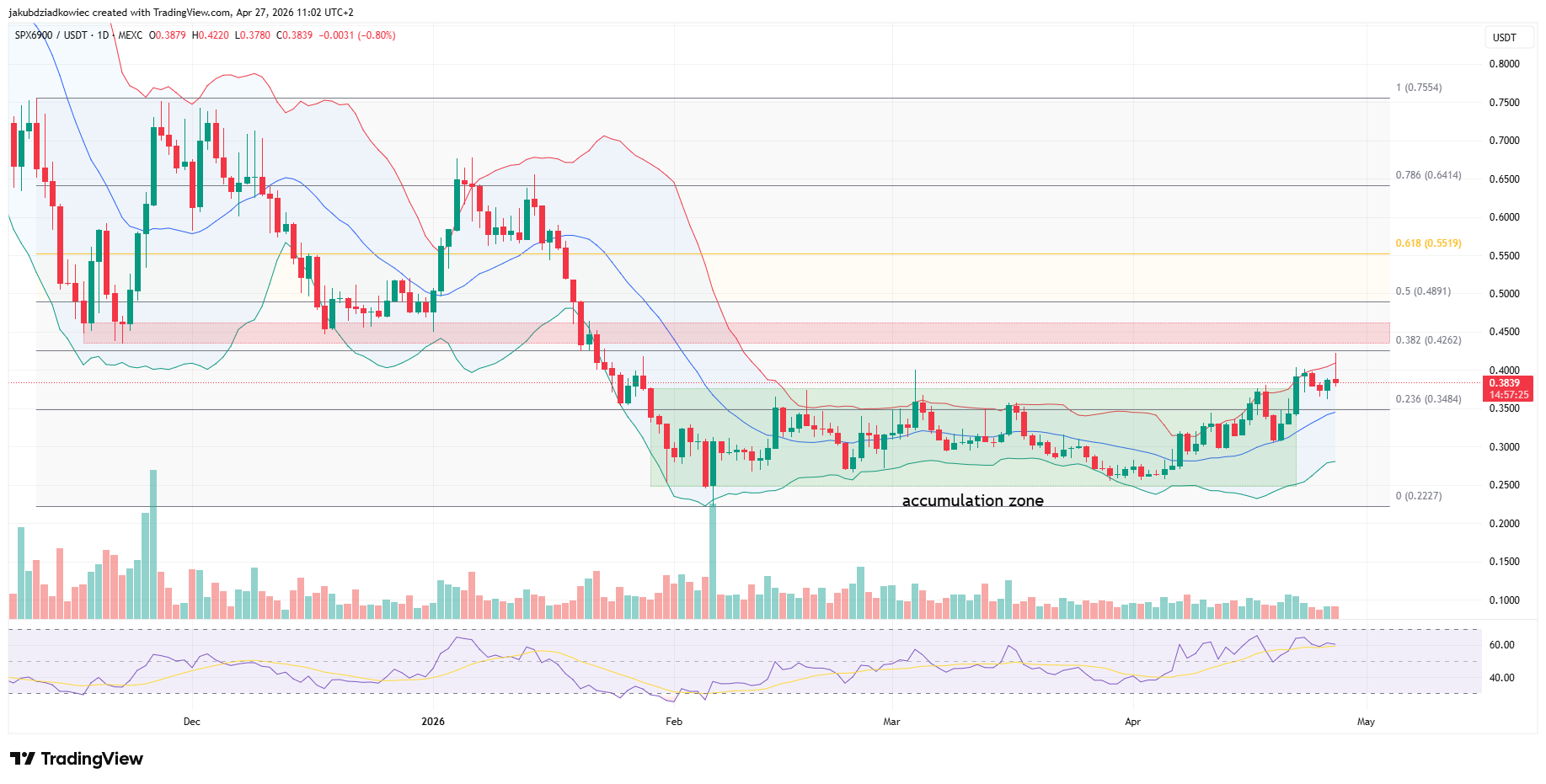 SPX6900 (SPX) sits near $0.3839 after a 19% weekly advance, mirroring a setup the token printed earlier in the year. Price emerged from an accumulation channel between $0.27 and $0.35 that held throughout most of February, March, and the first half of April.