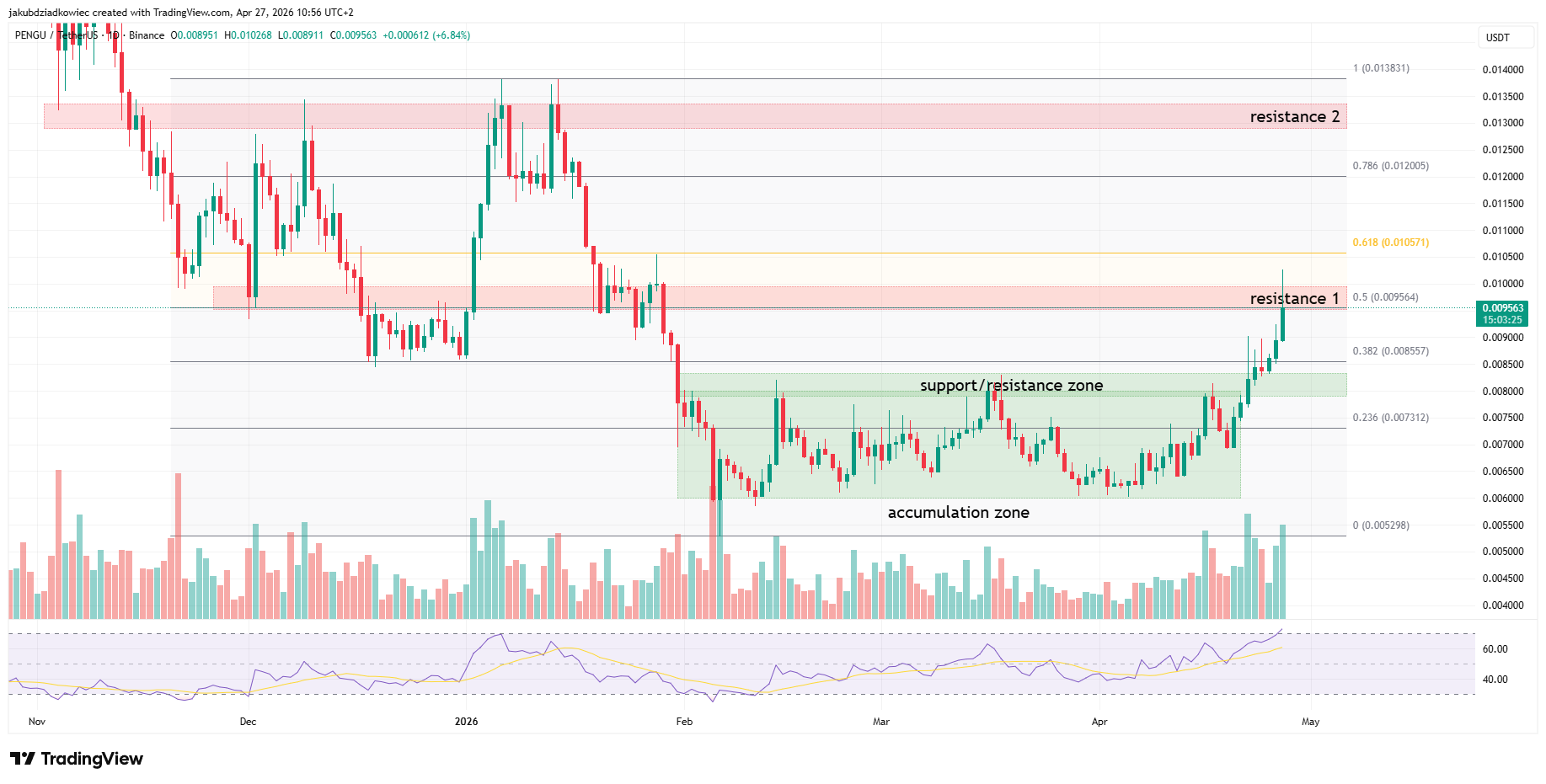 PENGU trades near $0.0096 after a 32% weekly surge. The token broke decisively above the $0.008 resistance zone that had capped price action since early February, flipping that level to support.