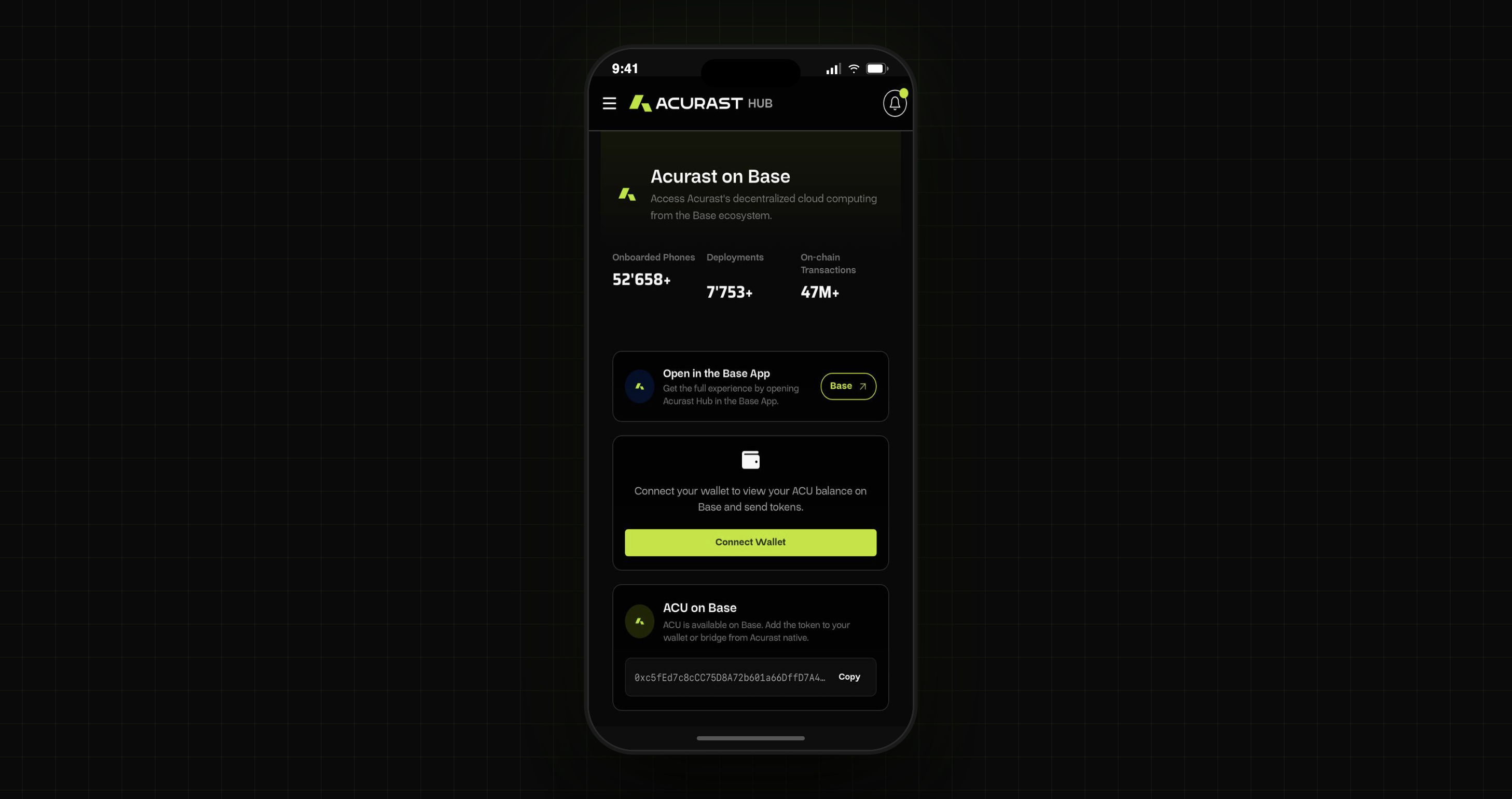 Developers leveraging Acurast on Base can onboard devices and manage compute infrastructure via the Acurast Hub with a Base wallet.