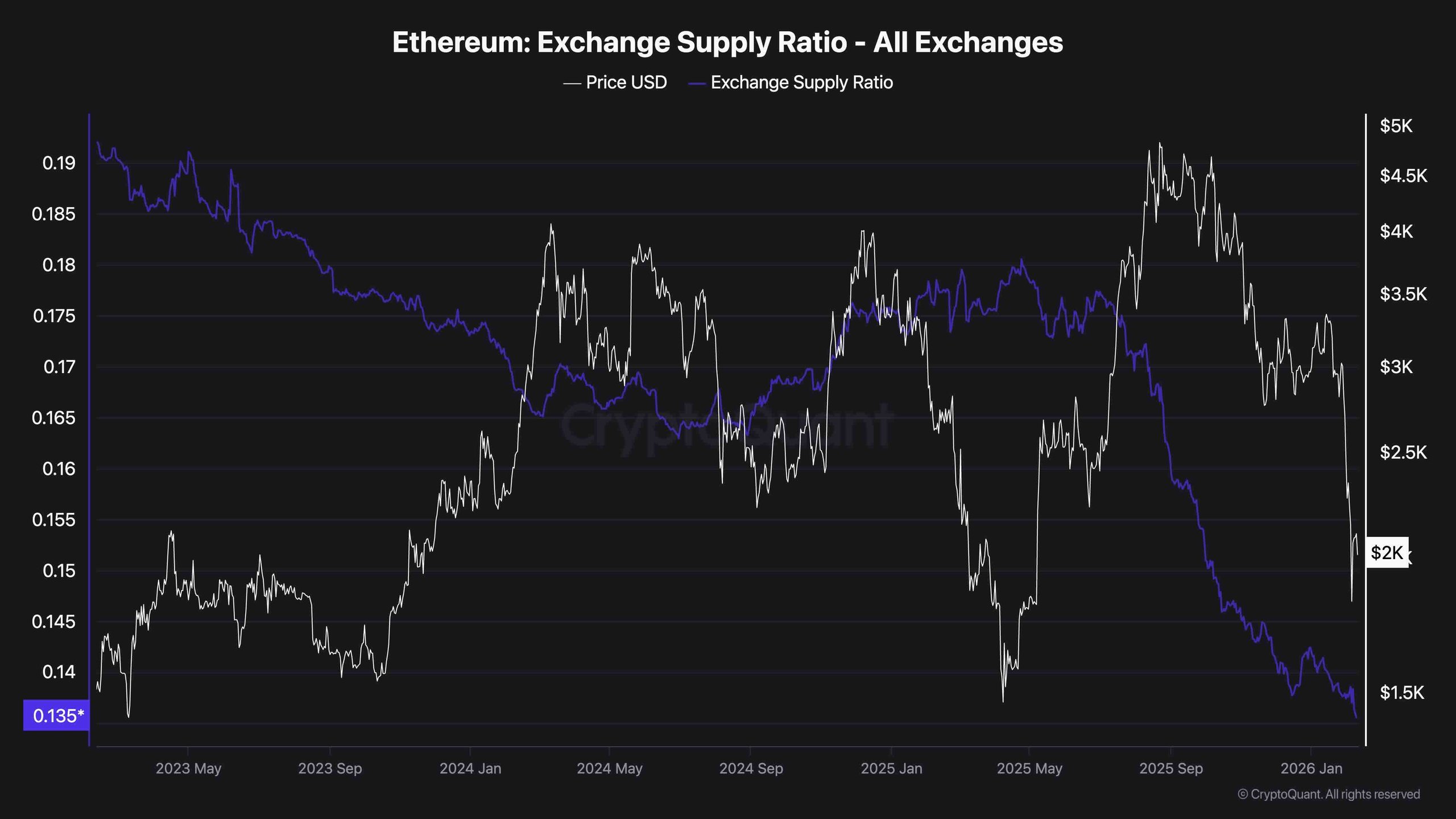 The Exchange Supply Ratio for Ethereum has continued to trend lower and currently sits near the lowest levels of the displayed series, around 0.135, implying that an increasingly smaller fraction of the total ETH supply is held on centralized exchanges. This persistent decline, even as prices have sold off toward the $2,000 area, suggests that a significant portion of the supply has migrated to self-custody or staking and is less immediately available for sale, reducing structural spot sell-side liquidity.